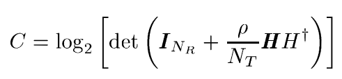 矩阵行列式:公式中的行列式反映了MIMO系统的传输特性,包括天线之间的相关性、信号传播路径的多样性等。