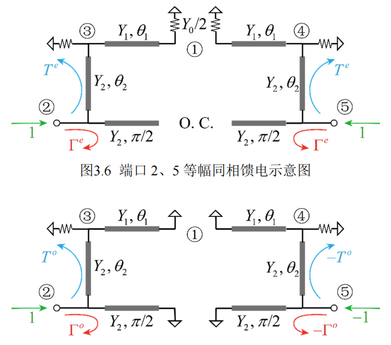 天线阵工作于特征向量x1 对应的模式时,两个端口的馈电等幅同相,这里称作偶模;工作于特征向量x2对应的模式时,两个端口的馈电等幅反相,称作奇模。