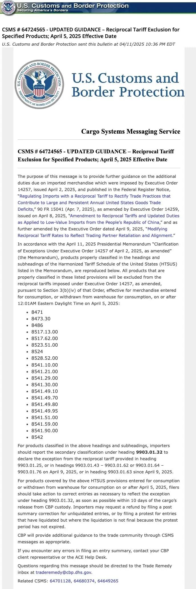 美东时间4月11日晚间,美国海关发布公告,根据特朗普总统当日签署的备忘录,对以下税号的商品不征收第14257号行政令(即4月2日发布的“对等关税"行政令,以及于4月8日和4月9日发布的修订行政令)下的“对等关税”。