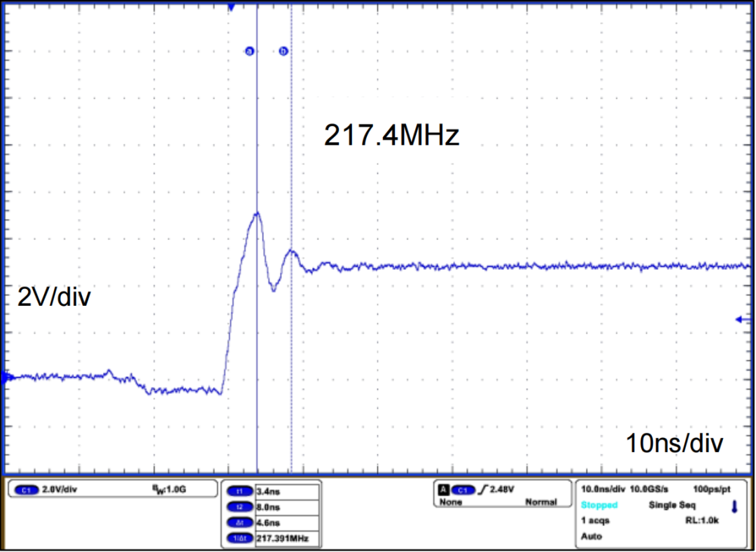 1. 因为需要使用示波器来测量振铃频率,所以在测试点的开关节点处一定要会使用探头。为了降低探头附加在开关节点处的寄生容量,将探针前端的挂钩尖端除去,使探头直接接触开关节点,因为接地引线会附加电感成分所以去掉。取而代之的是安装接地引线适配器,使接地长度最小化,放大振铃波形,图20-6测得频率为217.4MHz。