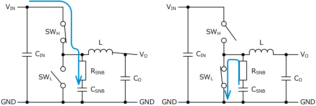 图20-5展示了缓冲电路的动作过程:当高边开关导通时,寄生电感蓄积的能量通过缓冲电容CSNB ,作为静电能量存储在电容里。开关节点电位会上升到输入电压VIN,当充电到VIN时,电容储存了1/ 2×CSNB×VIN×VIN能量。这时候缓冲电阻RSNB里会产生与充电能量相同的1/ 2×CSNB×VIN×VIN阻抗损耗。当低边开关导通时,开关节点会降低到GND电位,所以缓冲电容CSNB蓄积的能量会通过缓冲电阻(阻尼电阻)放电。这时候缓冲电阻RSNB会消耗1/ 2×CSNB×VIN×VIN能量。作为这个公式的补充说明,充电后电容电荷Q由CSNB×VIN求得,电源供电功率为VIN×Q=CSNB×VIN×VIN。电容蓄积能量和释放能量在充放电周期CR 常数设定足够长的话,只由电容容量和电压决定。充电时电源有一半能量由于电阻变成了焦耳热,剩下的一半作为静电容量储存在电容里。放电时蓄积的一半静电能量由于电阻变成了热能。即使电阻值变化,只会充放电所需时间发生变化,但是这个比例是一定的。