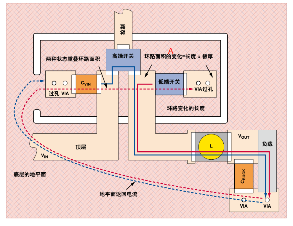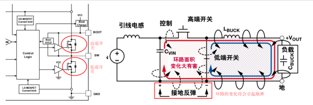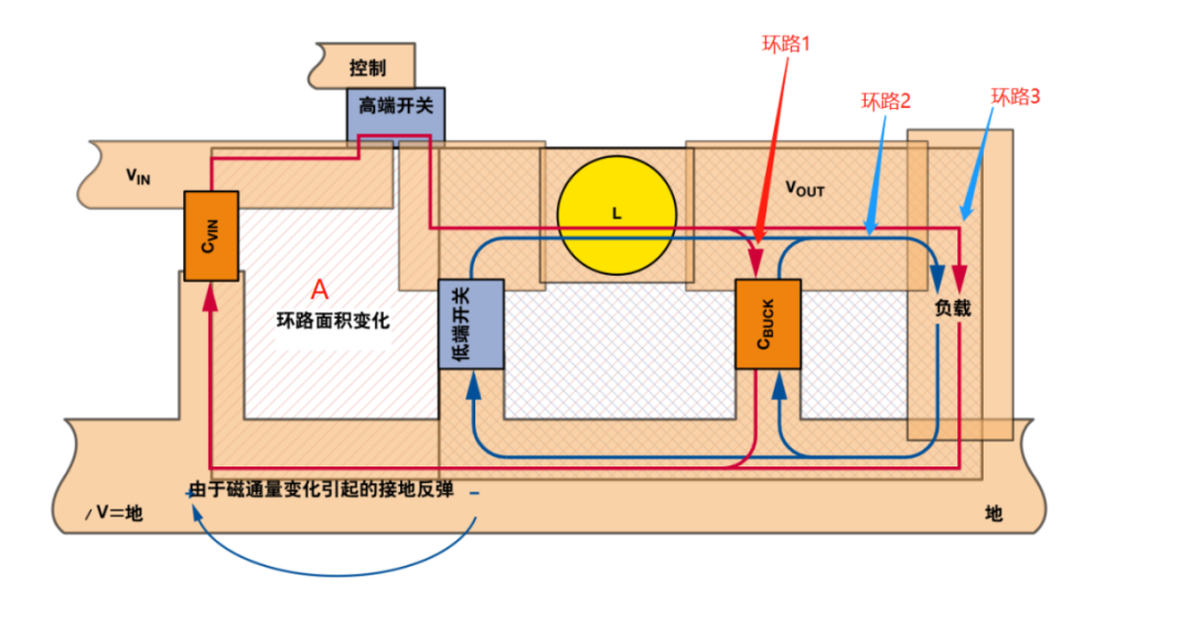 经过最终的分析,问题最终定位在与PCB的布局和布线有关,其中涉及一个重要容易忽略的技术:地弹。如下图,左图是芯片内部的原理框图,右图是实际PCB中的布局图,在高频开关电源中,提供能量来源的有两个器件:输入电容Cvin和电感Lbuck;(1)当高端开关闭合,低端开关断开时,电流的路径如红色箭头所示;(2)当高端开关断开,低端开关闭合时,电流的路径如蓝色的箭头所示。