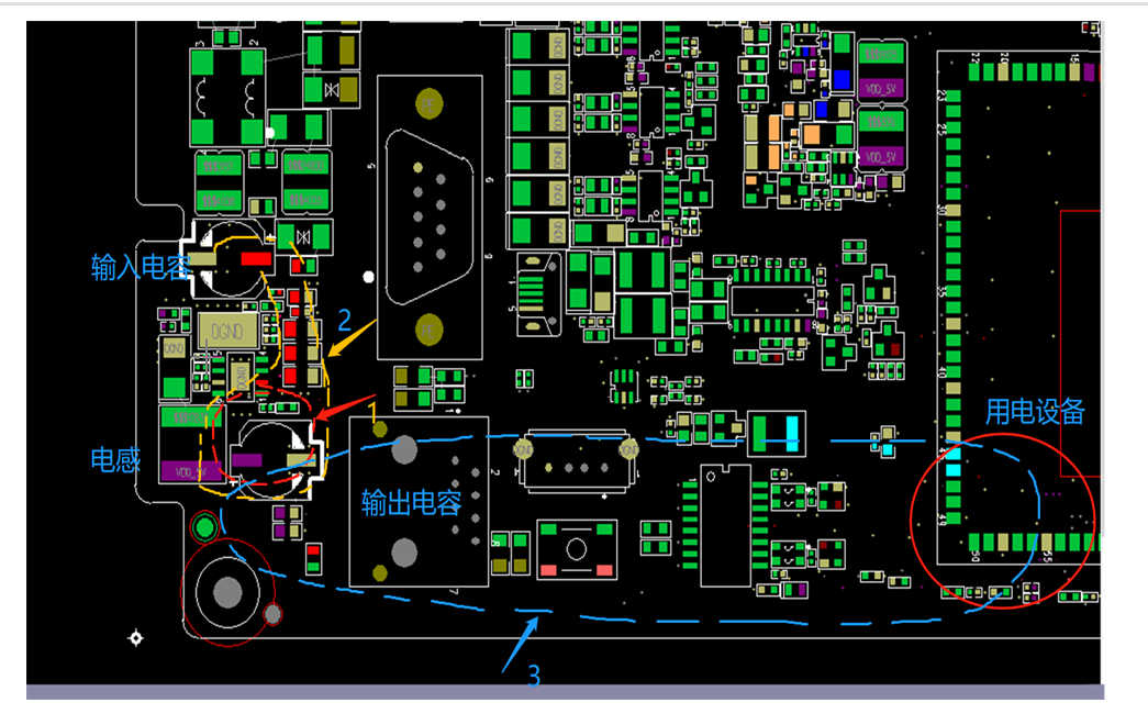 问题的原因主要时两种开关状态时的环路面积不一样,导致感应电动势变化太大,导致芯片内部的逻辑混乱。重新布局后的措施如下:(2)将输出电容和负载尽量靠近用电端,消灭上图中的环路2导致的变化。同时可以应付用电设备的突发电流,突发电流大部分由输出电容供电,而不是通过电源芯片转换而来。(3)重新布局后的环路面积变化=变化的长度X板厚度。板厚为2mm,此时的面积变化基本可以忽略不计。