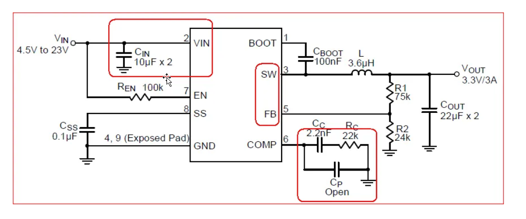 根据电磁感应定理:e=-dФ/dt=-d(Li)/dt=-Ldi/dt,由于红色和蓝色的环路面积变化较大,最终的体现会在低端开关和Cvin之间产生感应电动势。厂商内部手册中显示,电源芯片满足以下两个的条件,就可以进入测试模式,测试模式下,电源芯片不工作,电源无输出。我们实际设计的PCB示意图如下图所示,环路1由Cvin、高端开关、L、Cbuck、负载组成,环路2由Cbuck、负载组成,环路3由低端开关、L、负载组成。其中环路面积变化A最大,同时电流突变最最迅速,实测引脚6 COMP 最高可达到-0.6V。如果FB引脚耦合的干扰达到3V,是可以将芯片进入到测试模式的,导致无法输出。