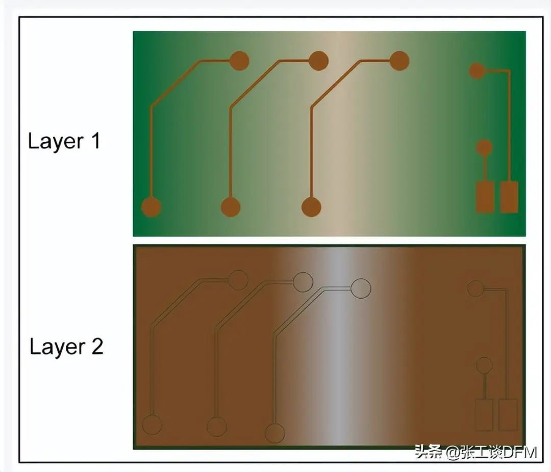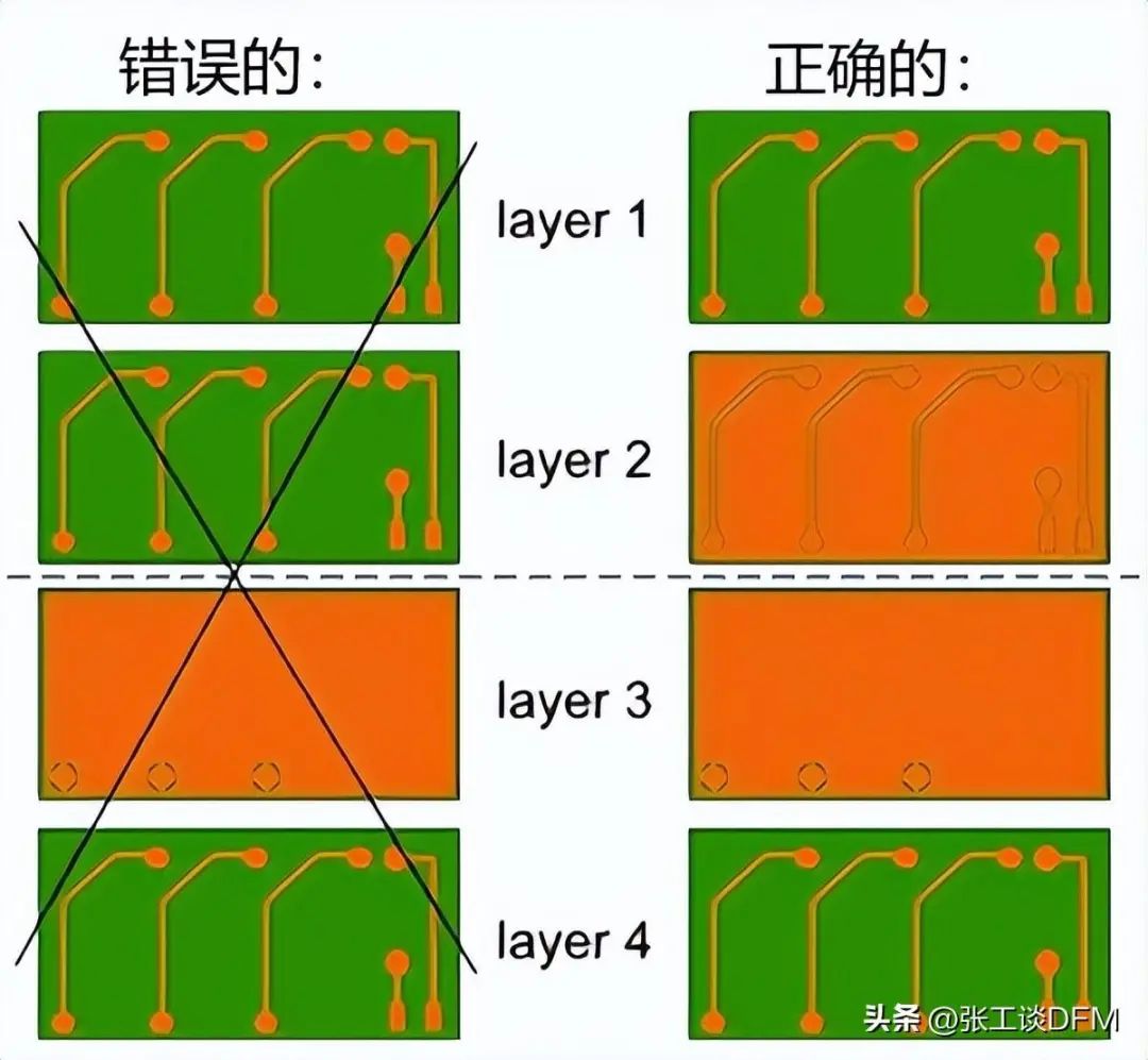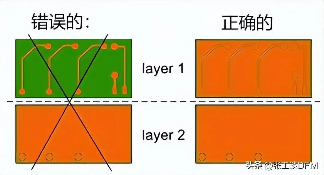导体走线应均匀分布在电路板上。尽量避免铜窝。走线应在每一层上对称分布。 9、盗铜