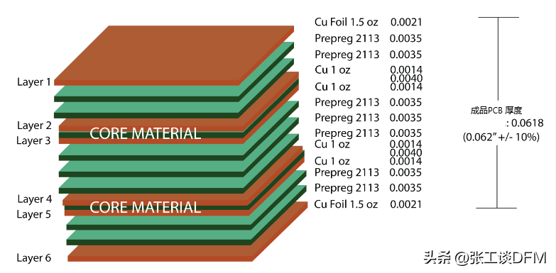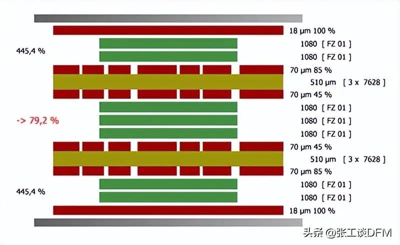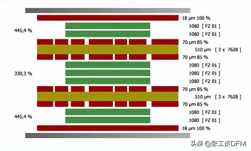 仅保持电源平面对称不足以达到均匀的铜包层。在分层和厚度问题上匹配预浸料和芯材也很重要。