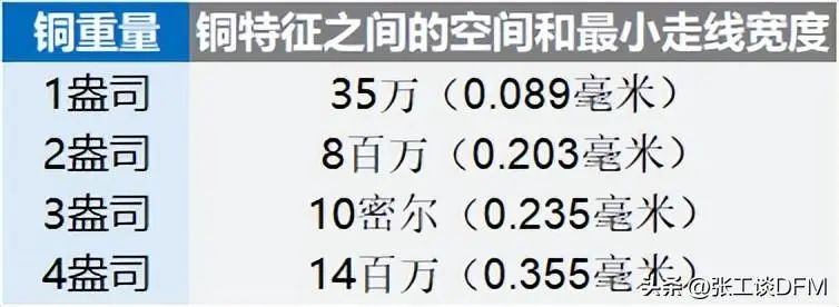 当你使用厚铜包层时,需要调节走线之间的间距。不同的设计师对此有不同的规范。下面是关于铜重量的最小空间要求的示例。
