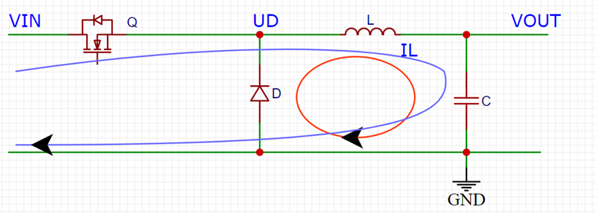 BUCK电路简易模型由NMOS管Q,续流二极管D,以及在输出端起储能作用的电感L,起滤波作用的电容C组成。当Q导通时,电源经开关管Q、储能滤波器件L、C为负载供电,同时为C充电,电流流经路径如上图蓝色所示;当Q管关断时,UD的电压为0,由于L的自感效应,电流路径如上图红色所示,续流二极管正向导通。