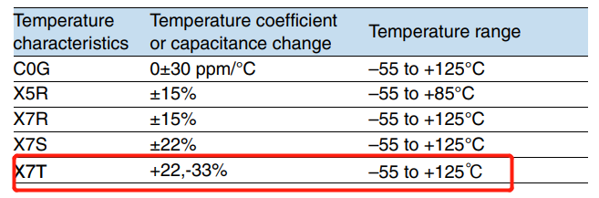 X7T,表示工作温度范围为-55~125°C,温度稳定性为+22/-33%的陶瓷电容。常用的陶瓷电容种类NP0、X7R、X5R和Y5V,主要区别是填充介质不同,从而引起温度、电压稳定性的不同。NP0是温度补偿型电容,是电容量最稳定的一种电容,常用于射频通讯电路谐振。工作温度范围为-55~125°C,在这个温度范围内,内容容量基本保持不变。