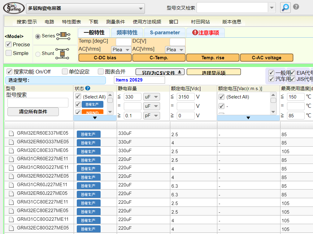 除了数据手册可以看出的重要参数,电容还有其他参数如ESR、直流偏压特性、谐振频率、容量随温度的变化情况,纹波电流造成的温升等。如何查找MLCC的这些参数呢?利用 Murata simsurfing 辅助工具可以在选型时事半功倍!