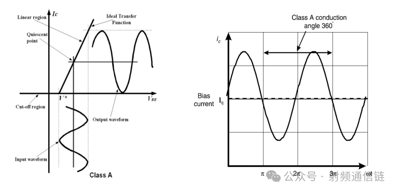 A 类放大器晶体管的导通角为 360°,这意味着晶体管在输入信号的整个周期内都导通。这使得 A 类成为所有放大器类型中最线性的,这里的线性度简单地指放大器的输出信号与输入信号的相似程度。