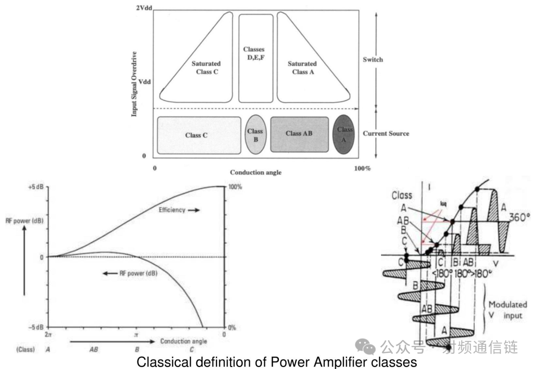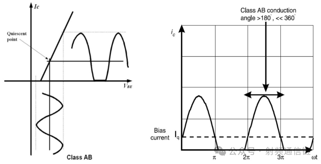 AB 类的导通角在 180° 到 360° 之间,效率在 50% 到 78.5% 之间。
