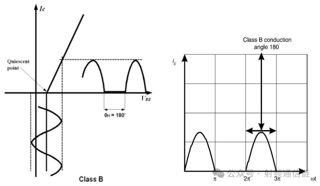 B 类放大器中晶体管的导通角约为 180°。