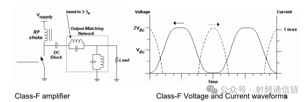 F 类通过在输出网络中使用谐波谐振器来塑造漏极波形,从而提高效率和输出。电压波形包含一个或多个奇次谐波,近似为方波,而电流包含偶次谐波,近似为半正弦波。或者( “反 F 类” ),电压可以近似为半正弦波,电流为方波。