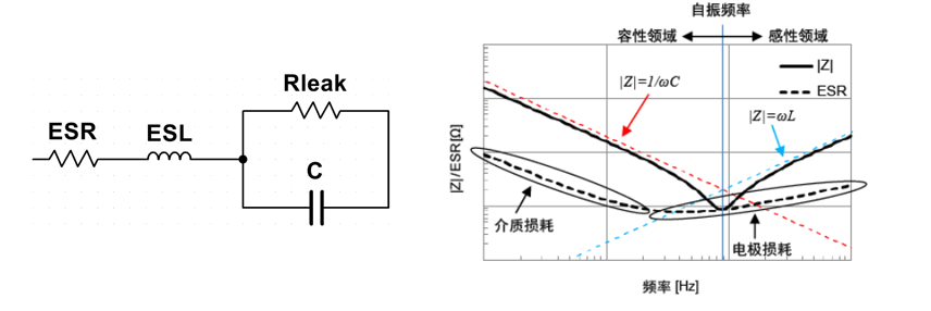 低频率范围的|Z|与理想电容器相同,都与频率呈反比趋势减少。ESR值也显示出与电介质分极延迟产生的介质损耗相应的特性。