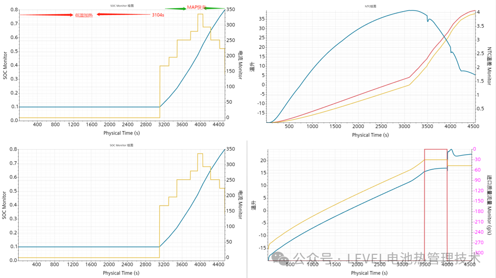 低温加热+map快充 | 环境-20℃,电池包初始-20℃, •冷却液流量18L/min,最大加热功率5kW(4.7),加热进口目标水温40℃,加热至0℃开始快充,加热至10℃停止加热。 •按充电MAP将实际SOC从10%充电至80%,流量18L/min,冷却策略:30开启冷却,25℃关闭冷却,最大制冷功率3.5kW(3.3),冷却进口目标水温18℃ |
