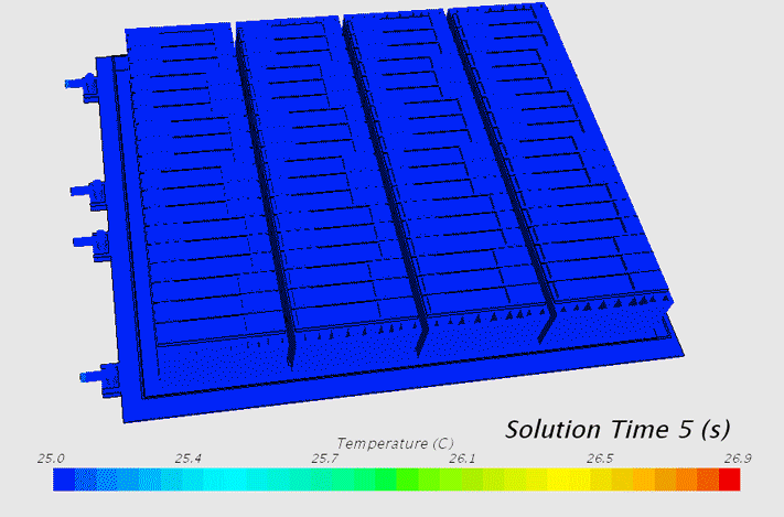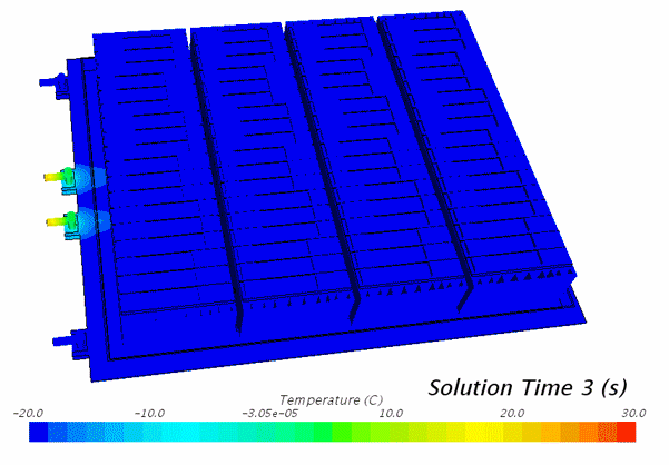 下图为在低温工况电池系统随着时间变化的温度云图,该工况模拟了新能源汽车在冬季寒冷得季节放置车 库一夜后,启动汽车把电池加热到能工作温度并进行高速行驶工况。