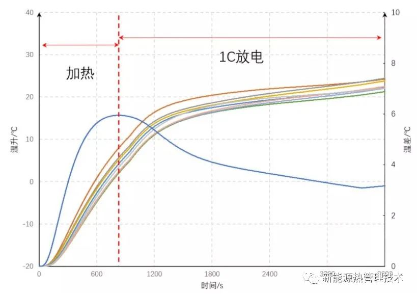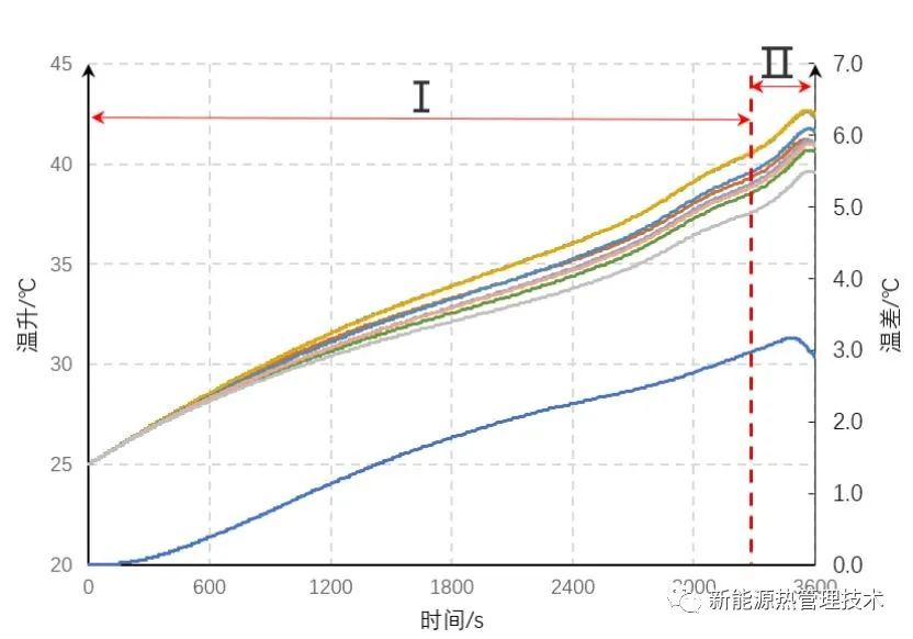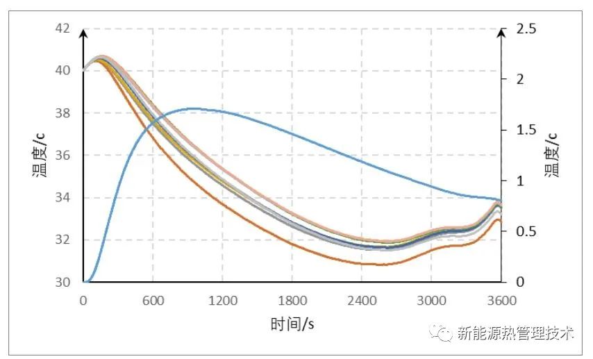 该工况模拟了新能源汽车在夏天室外环境曝晒一天后,启动汽车进行高速行驶工况,属于电池系统的高温冷却工况,下图为高温冷却电芯温度变化曲线上,分析得出1C满放的工况时,在冷却系统作用下,最高温度40.6℃,电芯间的最大温差1.8℃,满足热设计目标,在曲线末端出现温升现象,下图可看出电芯在放电末端发热量较大,通过计算,第Ⅱ阶段电芯的平均发热量是第Ⅰ阶段的1.8倍,所以在放电末端,电芯发热量增大,导致曲线末端出现温升现象。