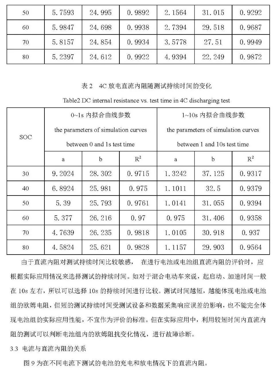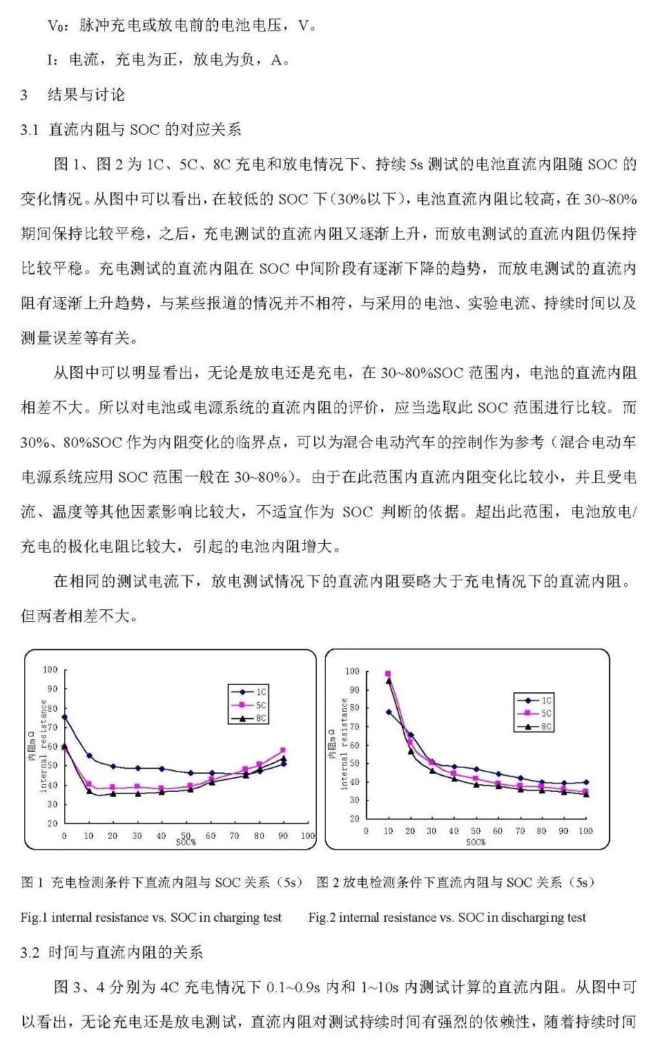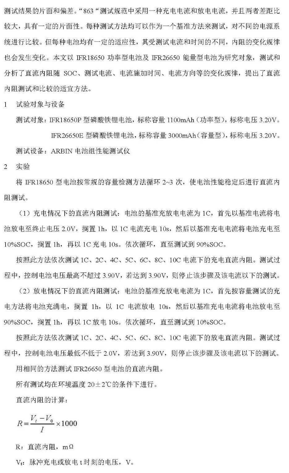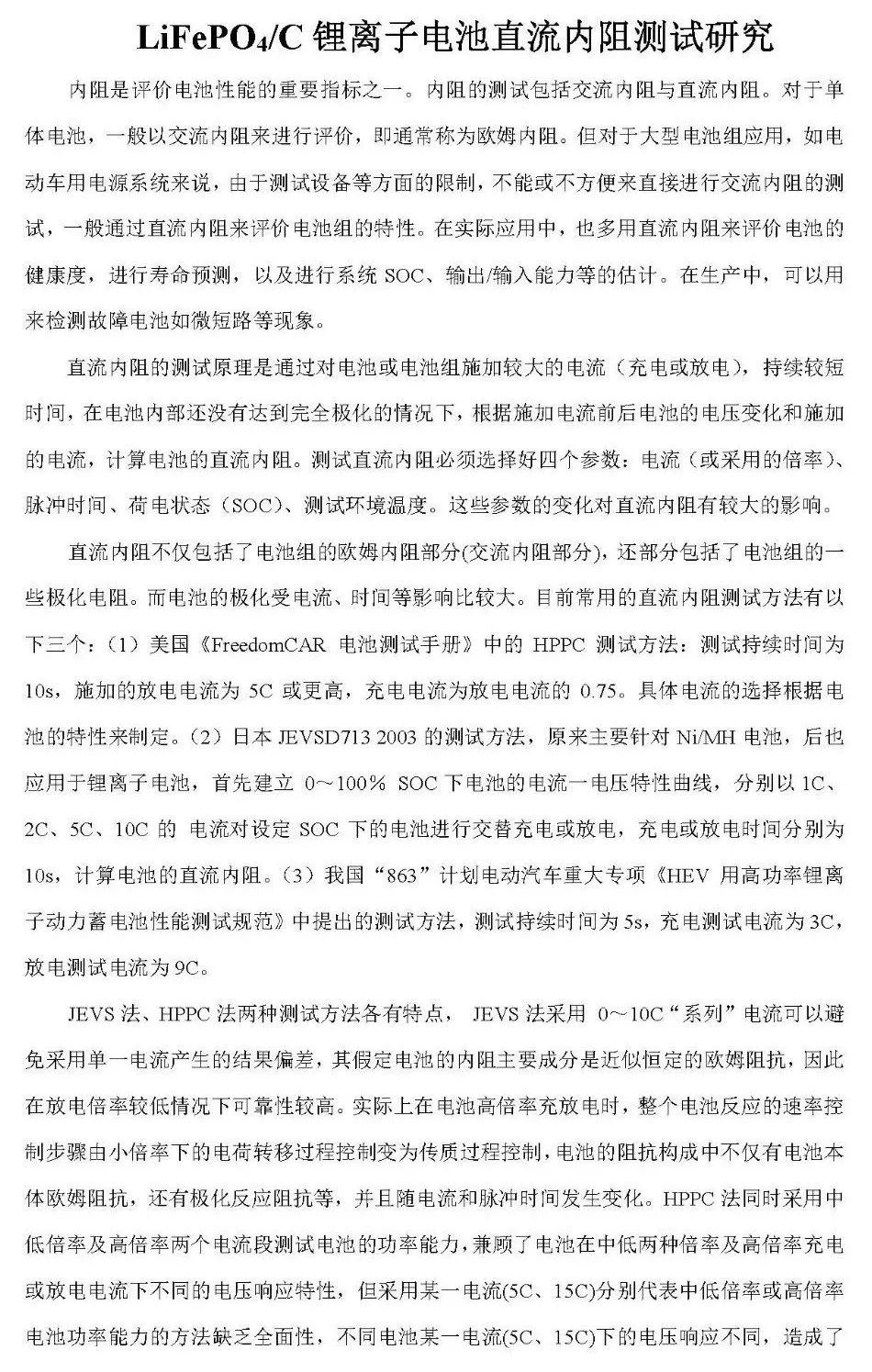 直流内阻不仅包括了电池组的欧姆内阻部分(交流内阻部分),还部分包括了电池组的一些极化电阻。而电池的极化受电流、时间等影响比较大。目前常用的直流内阻测试方法有以 下三个:(1)美国《FreedomCAR 电池测试手册》中的HPPC 测试方法:测试持续时间为10s,施加的放电电流为5C 或更高,充电电流为放电电流的0.75。具体电流的选择根据电 池的特性来制定。(2)日本JEVSD713 2003 的测试方法,原来主要针对Ni/MH 电池,后也应用于锂离子电池,首先建立0~100%SOC 下电池的电流一电压特性曲线,分别以 1C、2C、5C、10C 的电流对设定SOC 下的电池进行交替充电或放电,充电或放电时间分别为10s,计算电池的直流内阻。(3)我国“863”计划电动汽车重大专项《HEV 用高功率锂离子动力蓄电池性能测试规范》中提出的测试方法,测试持续时间为5s,充电测试电流为3C,放电测试电流为9C。