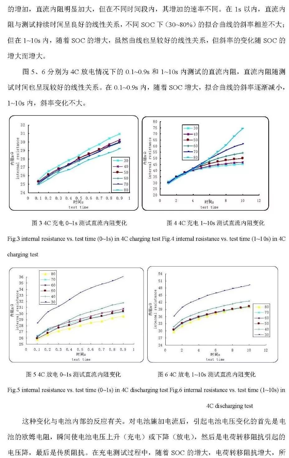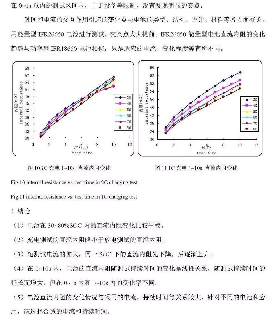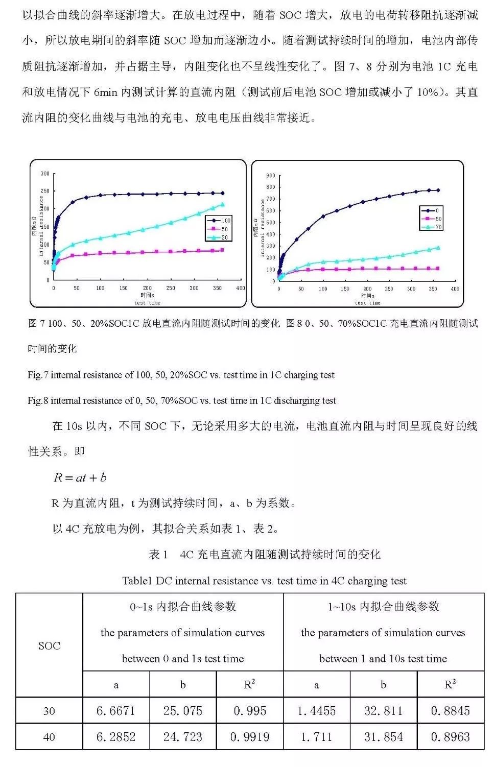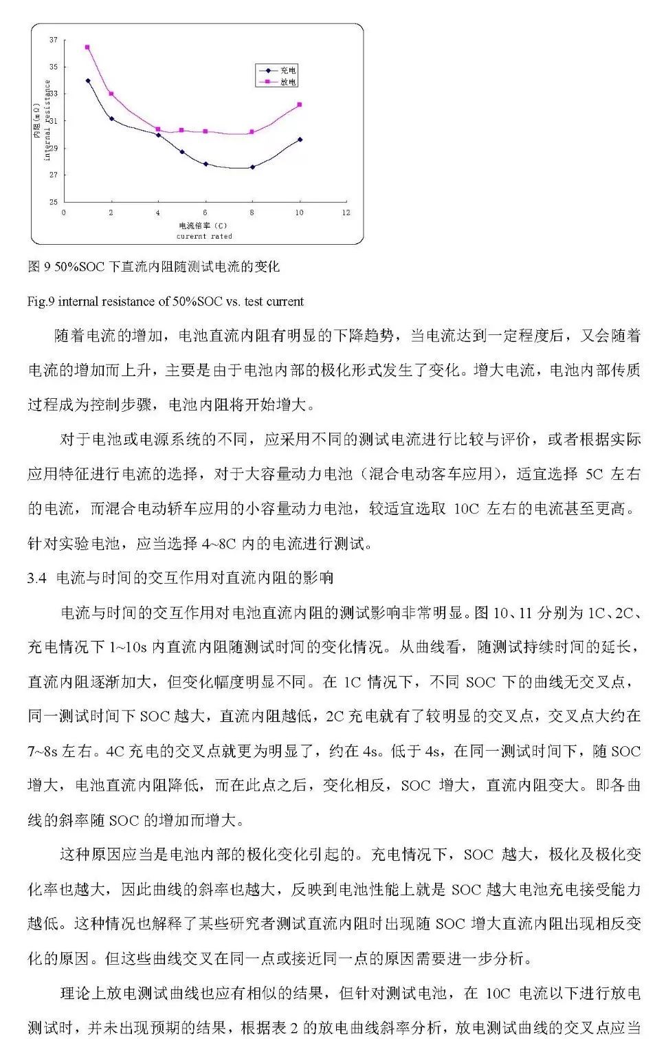 直流内阻不仅包括了电池组的欧姆内阻部分(交流内阻部分),还部分包括了电池组的一些极化电阻。而电池的极化受电流、时间等影响比较大。目前常用的直流内阻测试方法有以 下三个:(1)美国《FreedomCAR 电池测试手册》中的HPPC 测试方法:测试持续时间为10s,施加的放电电流为5C 或更高,充电电流为放电电流的0.75。具体电流的选择根据电 池的特性来制定。(2)日本JEVSD713 2003 的测试方法,原来主要针对Ni/MH 电池,后也应用于锂离子电池,首先建立0~100%SOC 下电池的电流一电压特性曲线,分别以 1C、2C、5C、10C 的电流对设定SOC 下的电池进行交替充电或放电,充电或放电时间分别为10s,计算电池的直流内阻。(3)我国“863”计划电动汽车重大专项《HEV 用高功率锂离子动力蓄电池性能测试规范》中提出的测试方法,测试持续时间为5s,充电测试电流为3C,放电测试电流为9C。