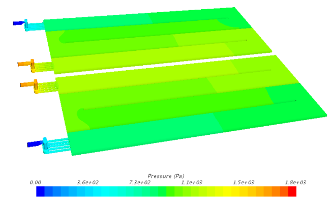 从云图6中我们可以看到,在不到1min的时间内,冷却液充满整个液冷板内腔。同时在流道的转弯区有漩涡现象,有优化空间。图8通过STAR-CCM+仿真工具计算出来的液冷系统的压力云图,从仿真的结果上看,系统的压降为1.8kPa,整个系统采用两进两出的两个并联结构,流量的均匀性必然满足设计要求。