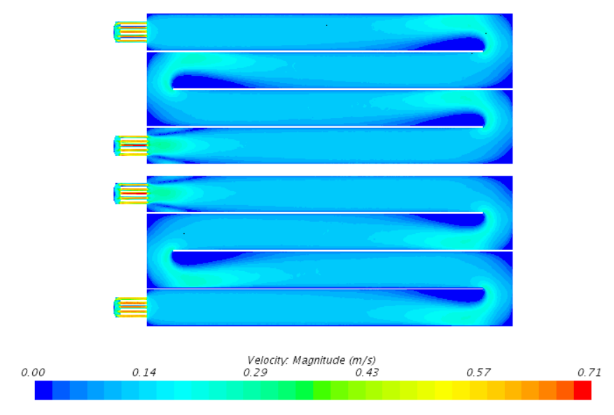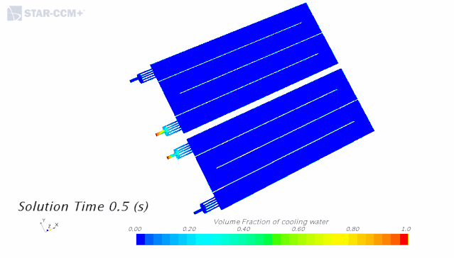 利用STAR-ccm+软件的VOF模型,清楚的仿真出液冷板内从开始注入冷却液到注满冷却热的过程。设置进口两相材料的体积分数:cooling water:air=1:0设置出口两相材料的体积分数cooling water:air=0:1