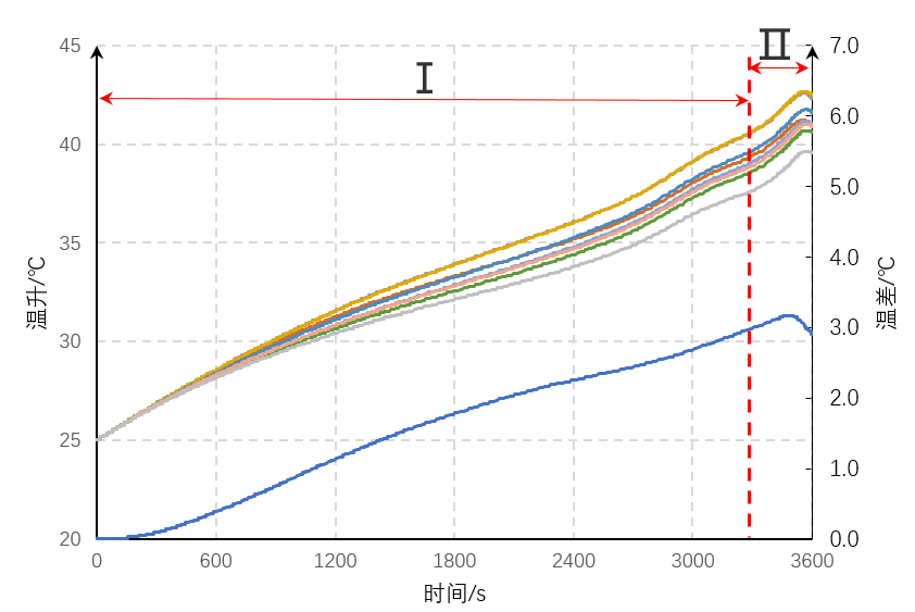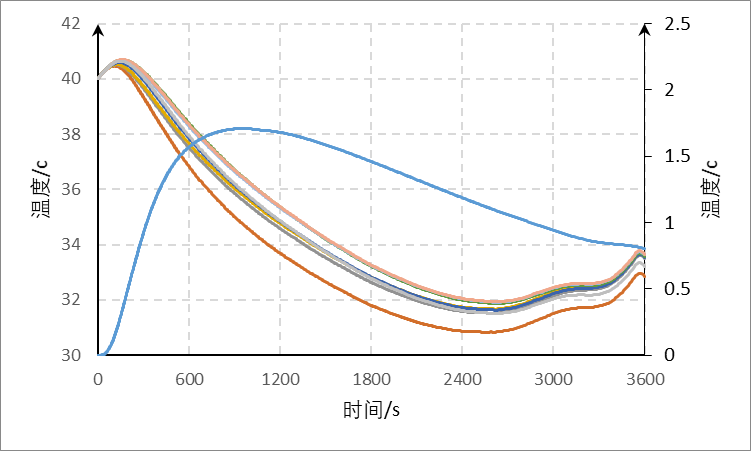 该工况模拟了新能源汽车在夏天室外环境曝晒一天后,启动汽车进行高速行驶工况,属于电池系统的高温冷却工况,图10高温冷却电芯温度变化曲线上,分析得出1C满放的工况时,在冷却系统作用下,最高温度40.6℃,电芯间的最大温差1.8℃,满足热设计目标,在曲线末端出现温升现象,由图7可看出电芯在放电末端发热量较大,通过计算,第Ⅱ阶段电芯的平均发热量是第Ⅰ阶段的1.8倍,导致曲线末端出现温升现象。