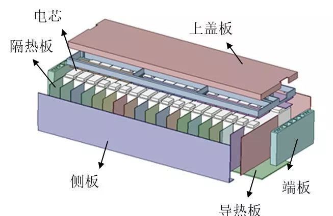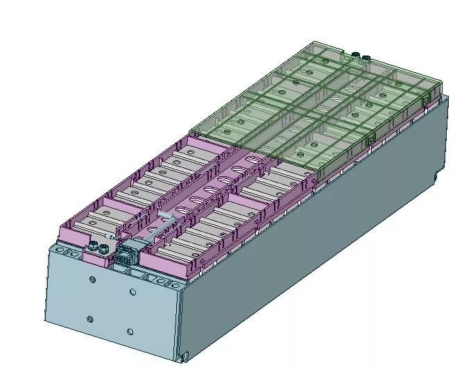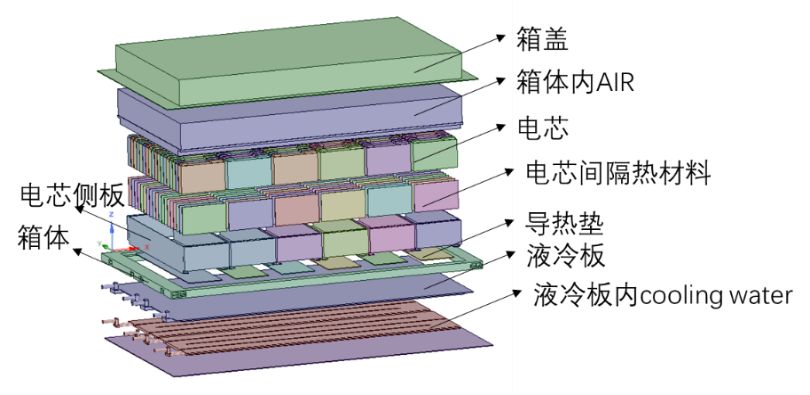 本案列电池系统采用液冷热管理方式的,如图1和图2所示是电池PACK系统前处理模型,主要包括:上下箱体,液冷板,导热垫、隔热护板、绝缘板、模组等结构,由4个模组成,每个模组由18个50Ah方形电芯组成。