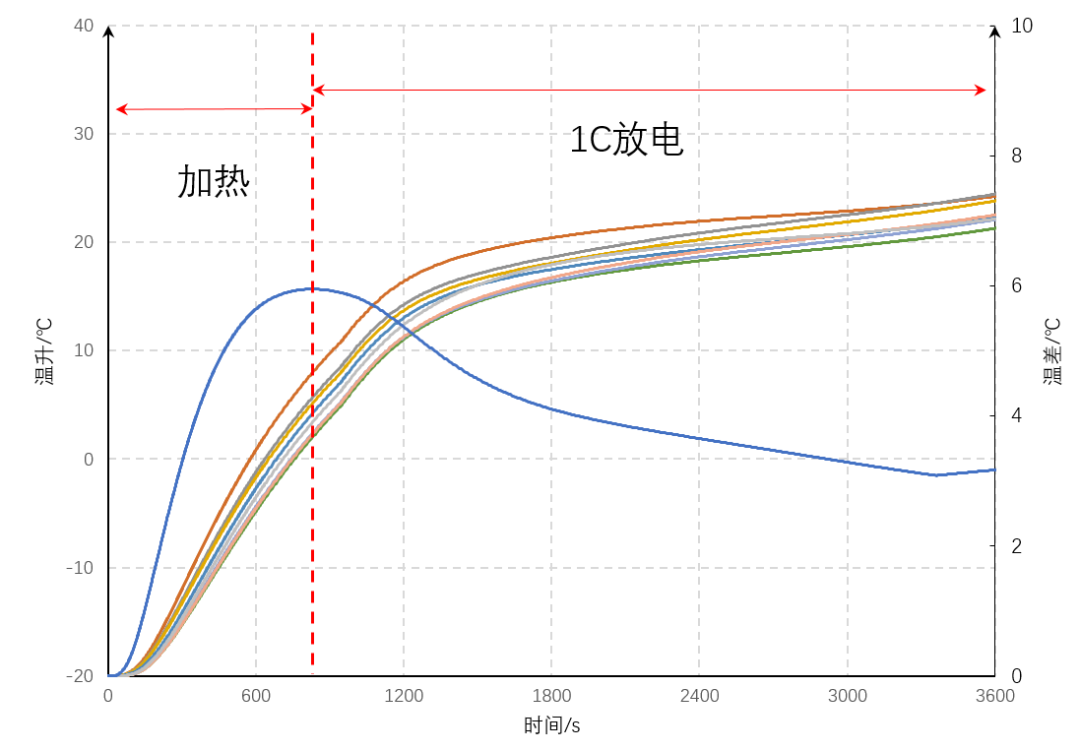 差整体先增大后减小,加热拉大电芯温差,放电过程温差减小,主要是由于放电过程中每个电芯发热量一样,发热较电芯底部加热热量更加均匀。