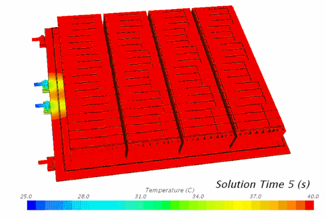 利用ANSYS-SCDM软件对电池包PACK建模前处理,以STAR-CCM+软件作为液冷系统流场仿真和PACK热场仿真的工具,建立热流场仿真分析模型,最终实现了对动力电池在低温停车加热工况,常温行车、高温行车等工况PACK内部电池温度变化情况仿真,同时实现了对液冷系统内部压降和流量均匀性仿真,对冷板结构设计提出合理依据。