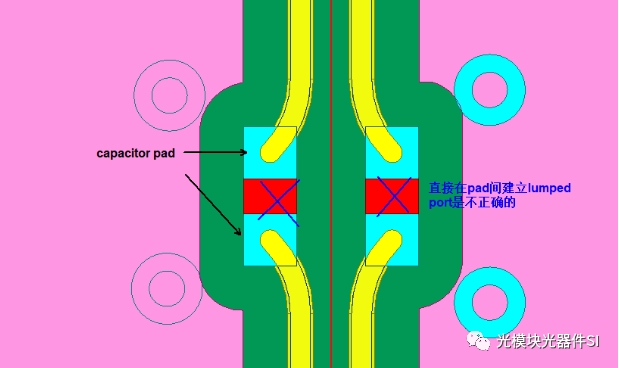 a、直接在电容的两个pad之间建立lumped port是不正确的,此时只能建立2个single-port model;