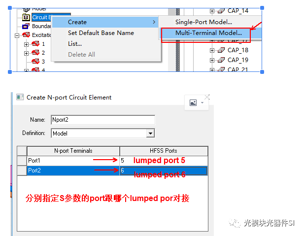 b、正确的做法是先建立4个对地的lumped port,跟通常建立port的方法一样,然后create multi-terminal model,由于导入的电容是s2p file,因此需要操作两次create multi-terminal model。