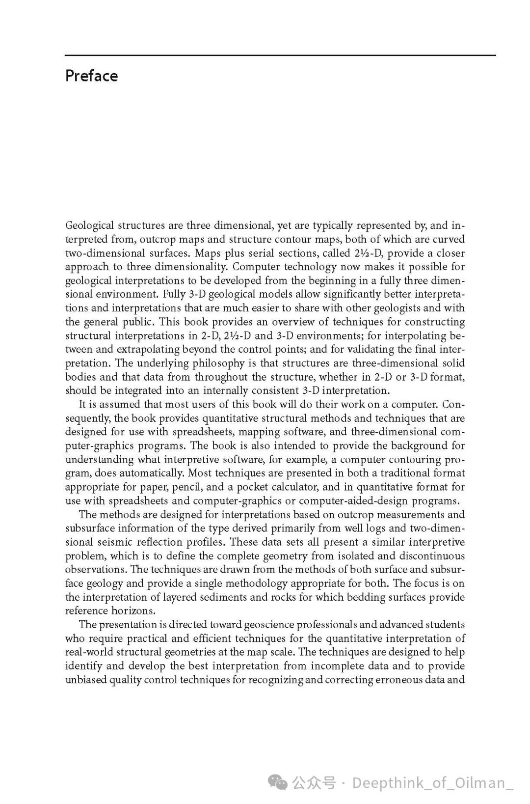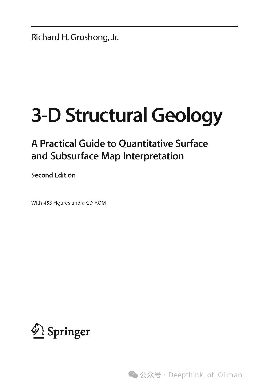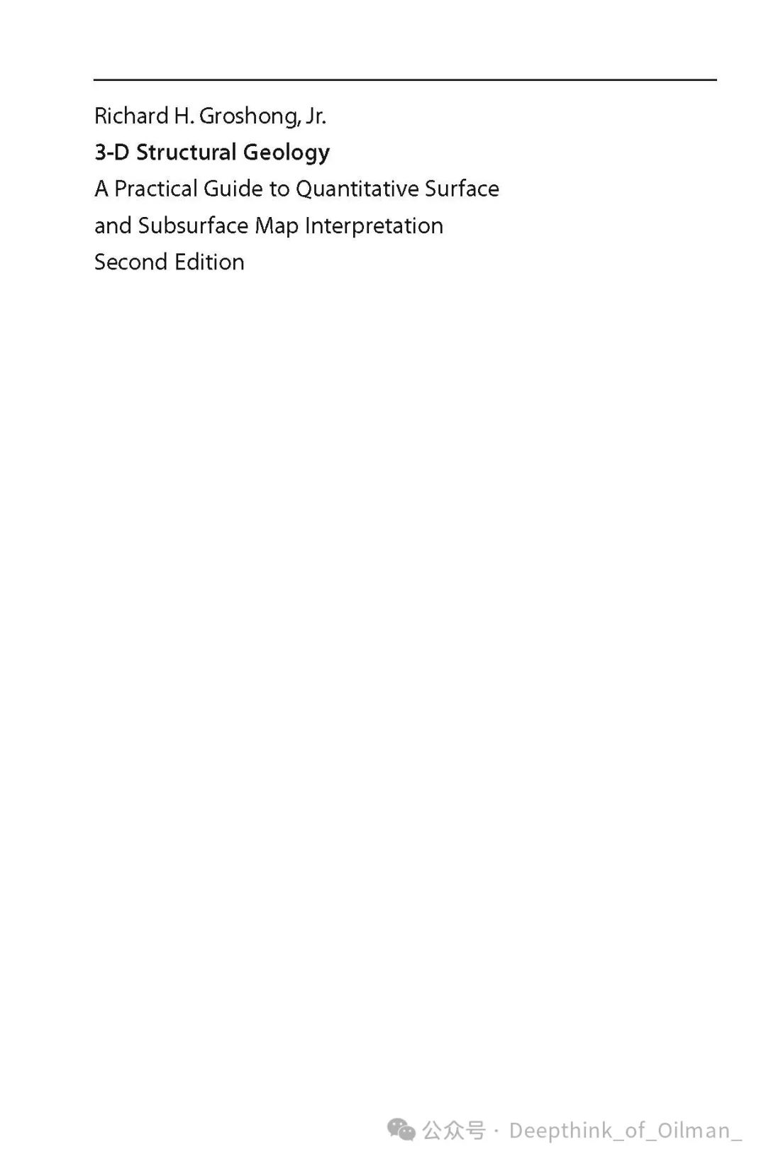 《3-D Structural Geology》(第二版)以纯白封面的极简美学映衬三维地质学的精密内核,Richard H. Groshong, Jr.将复杂构造建模转化为可量化操作的技术手册。书名中醒目的“3-D”符号冲破传统二维图件的思维桎梏,副标题“定量地表与地下地图解译实践指南”直指核心方法论——通过走向玫瑰花图、褶皱轴面投影等453幅插图,系统解构如何将露头测量、地震剖面与钻孔数据熔铸为三维构造模型。书中独创的“体积平衡校验法”与CD-ROM附带的三角剪切带模拟程序,使阿尔卑斯推覆体、盐底辟构造等经典案例跃出纸面,以数学约束重塑地质想象力。这部兼具学术严谨性与油田实用性的指南,犹如封面未被冗余设计沾染的纯粹质感,为地质学家架设起从图纸符号到地下宫殿的立体认知桥梁。 著作权归作者所有,欢迎分享,未经许可,不得转载