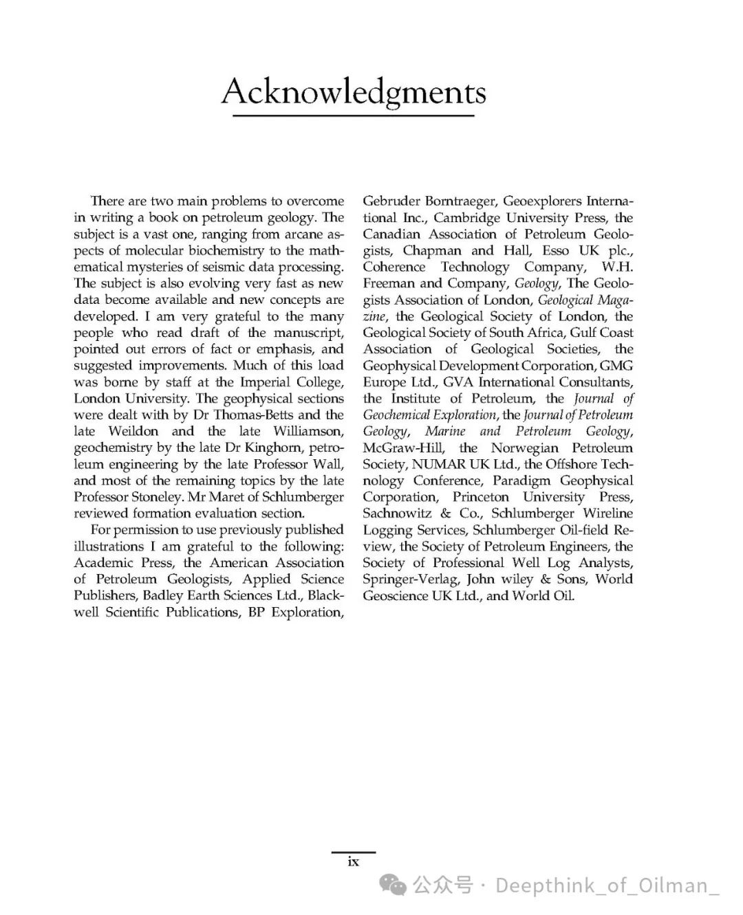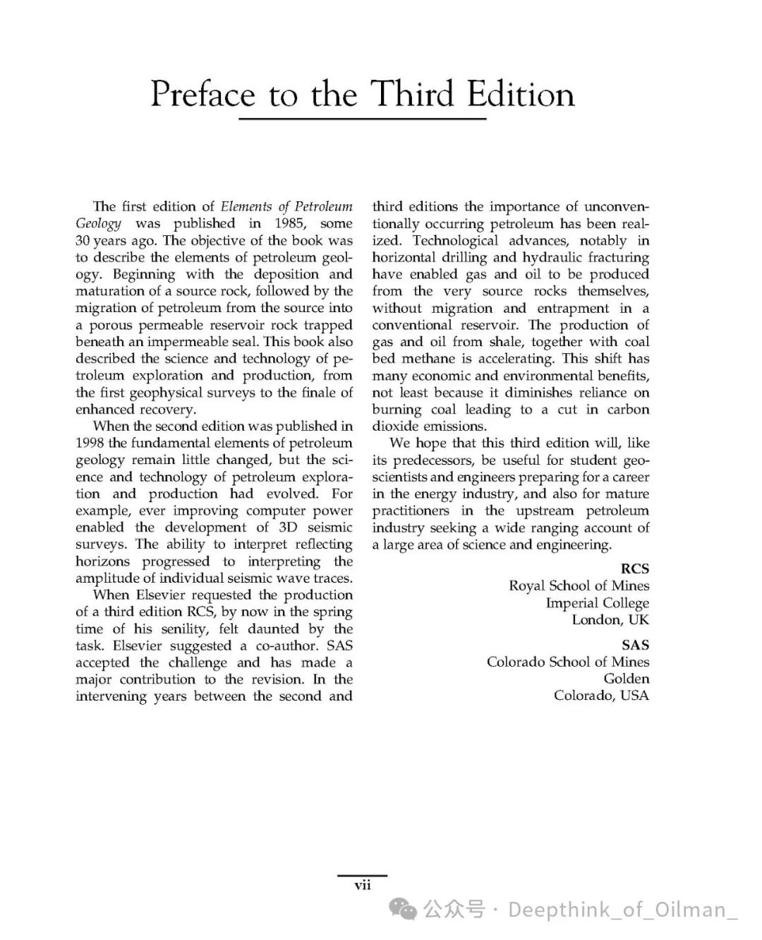 《Elements of Petroleum Geology》(第三版)由国际知名石油地质学家Richard C. Selley与Stephen A. Sonnenberg合著,Elsevier与Academic Press联合出版,是一部融合经典理论与行业前沿的石油地质学权威著作。纯白封面上的黑色衬线字体与简洁的细线分隔设计,恰如其分地呼应了石油地质学严谨的学科特质——从地层沉积到烃类运移的每一个环节都需精准的逻辑推演。书名中的“Elements”一词既暗示内容对学科核心要素的系统拆解,亦隐喻石油系统形成的地质要素耦合,如封面底部并列的Amsterdam、Boston、Heidelberg等出版城市符号,串联起全球油气盆地研究的空间维度。第三版更新内容尤其注重页岩革命后的学科范式转型,新增非常规储层表征、三维地震解释与成藏动力学模拟等章节,例如通过北海油田与二叠纪盆地的对比案例分析,阐释致密砂岩气与页岩油成藏机理的差异。全书以石油系统的“生储盖圈运保”六要素为叙事主线,构建起从微观烃源岩有机地球化学到宏观盆地分析的跨尺度认知框架。开篇以封面细线般的极简图示切入,还原古代藻类在缺氧环境下的热降解过程,定量讨论干酪根类型(Ⅰ-Ⅲ型)与生烃窗温度的对应关系;继而以三角洲沉积体系为例,详解储层非均质性如何通过岩相组合与成岩作用控制油气分布,并引入机器学习岩性识别技术,展示数字化时代测井曲线解释的精度提升。书中独创的“勘探思维训练”模块,将墨西哥湾盐下油藏、西非深水扇等经典案例转化为地质谜题,引导读者通过地震剖面异常体识别与地层压力梯度计算,逐步解锁圈闭有效性评价的关键参数。相较于前两版,本版显著强化了环境与经济的交叉视角:既剖析油气勘探中的CO2封存潜力与水文地质风险,亦以北美页岩气开发为例,探讨水平井工厂化作业对传统资源评估模型的颠覆。封面底部Elsevier与Academic Press的双重学术背书,象征着本书兼具理论深度与工业实用性的独特价值——既可作为高校地质专业的“找油哲学”启蒙教材,其附录收录的储量分类标准(SPE-PRMS)与孔隙度-渗透率关系图谱,又能为油藏工程师提供勘探目标优选与开发方案设计的快速参考。这部跨越四十载修订的学科经典,始终如封面黑白对比般清晰界定着石油地质学的认知边界,为全球能源转型中的地质学家提供历久弥新的理论工具箱。 著作权归作者所有,欢迎分享,未经许可,不得转载