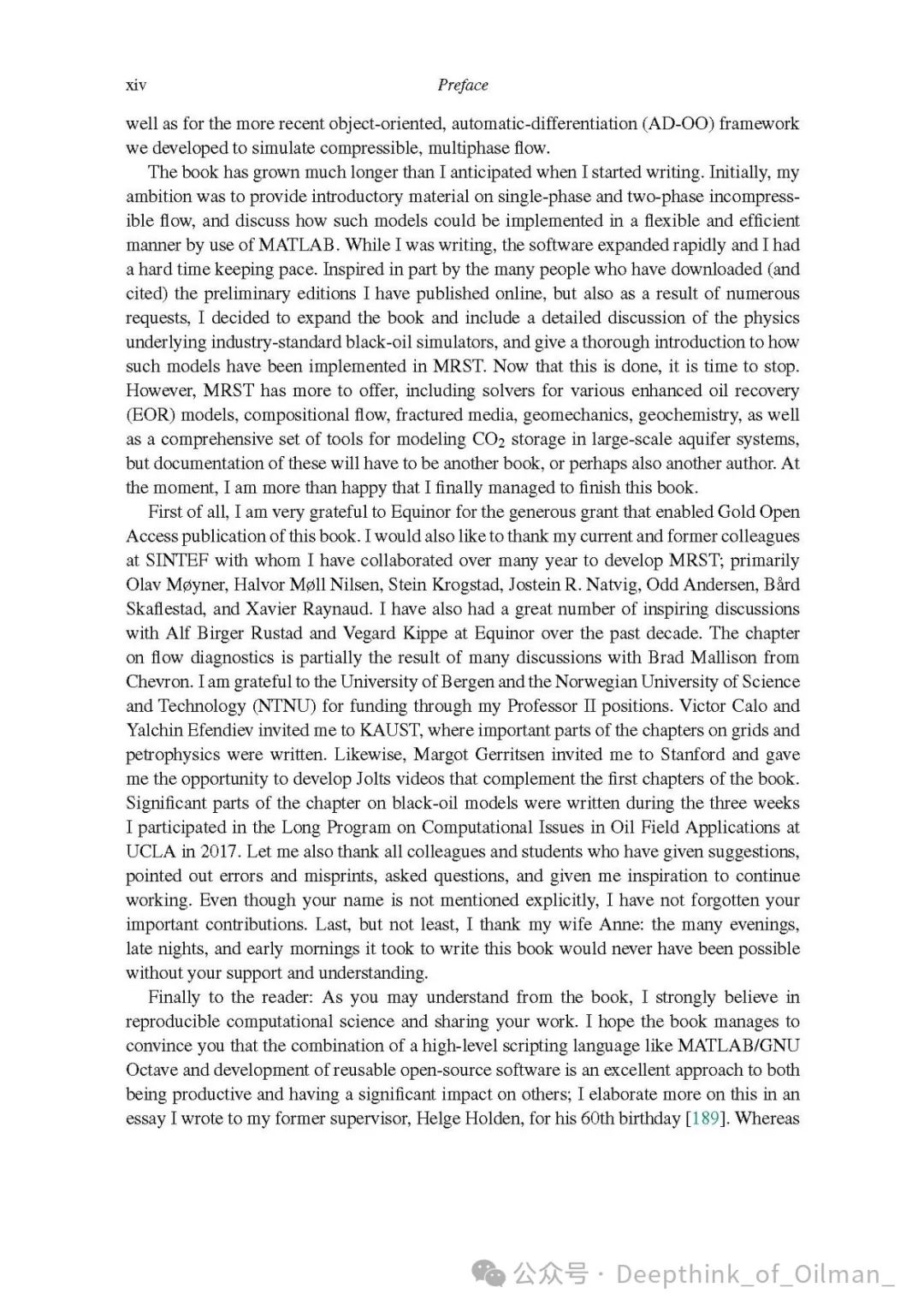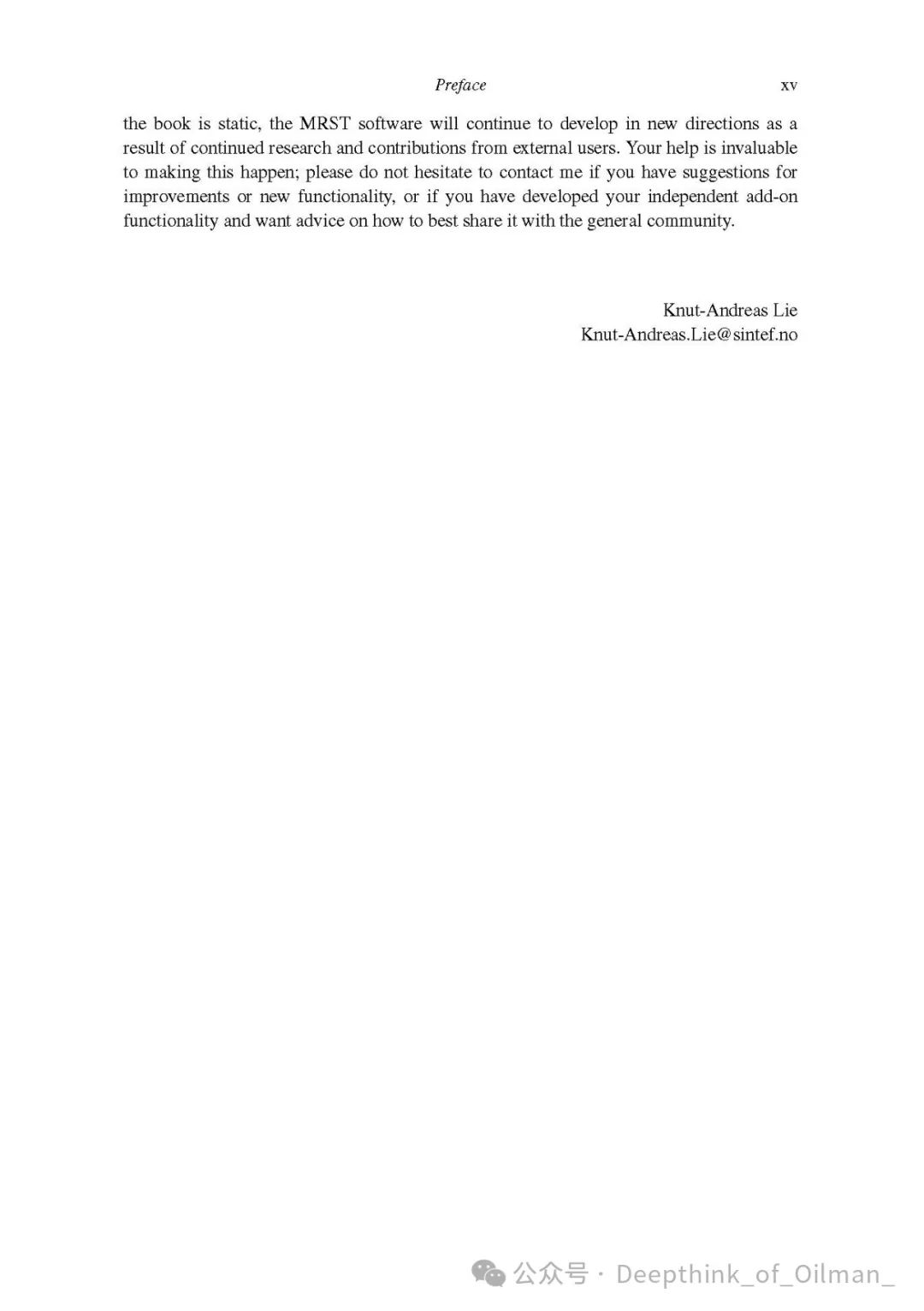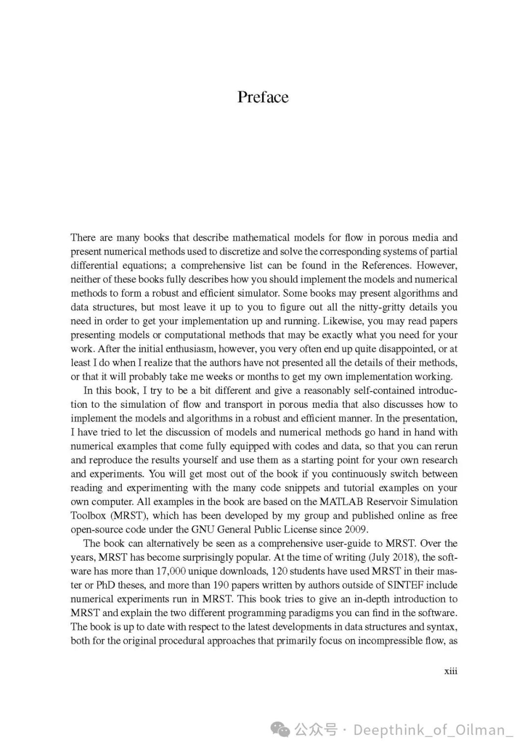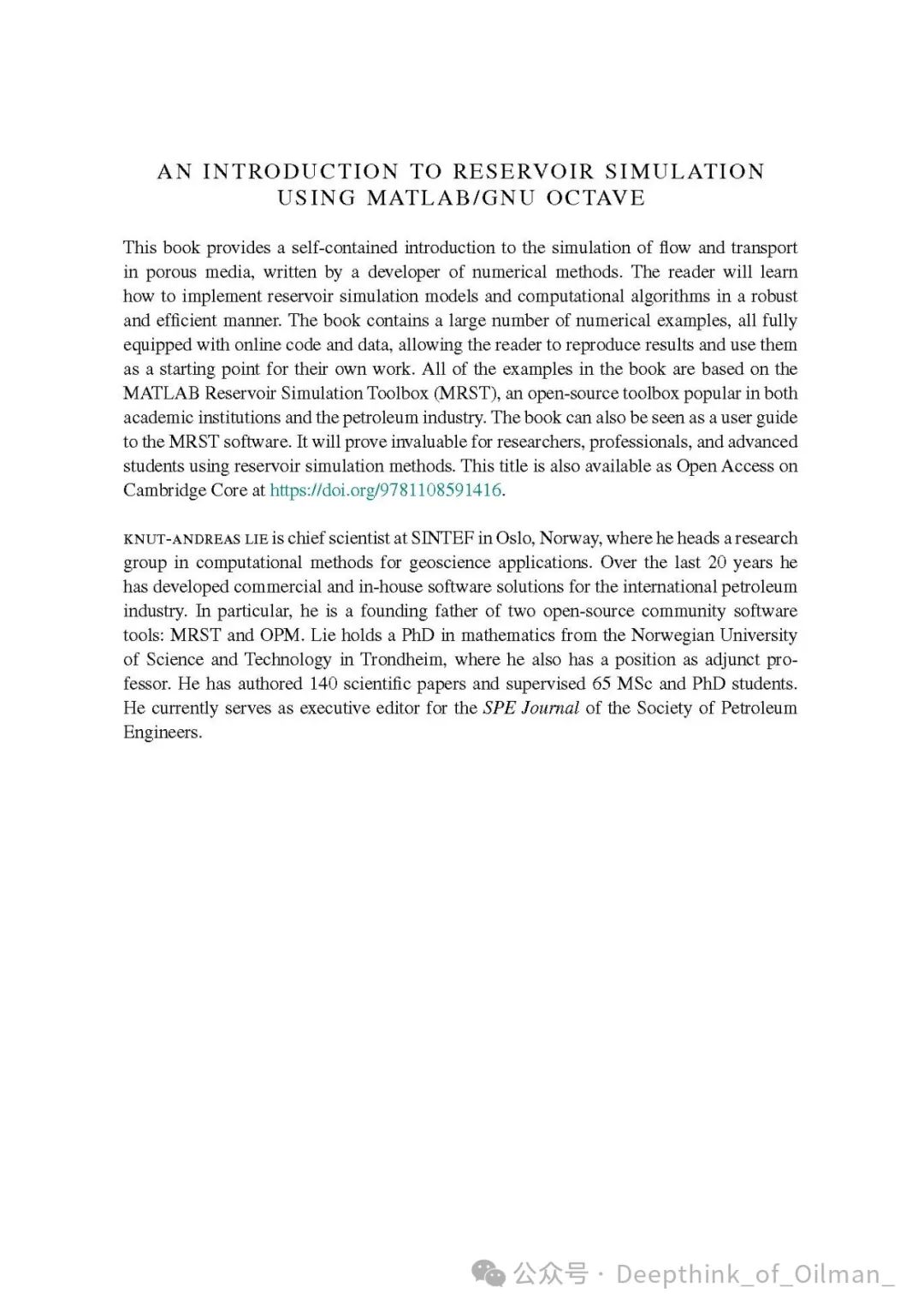 《An Introduction to Reservoir Simulation Using MATLAB/GNU Octave》是一本将油藏数值模拟理论与编程实践相结合的实用指南,旨在为石油工程、地质科学及相关领域的学生、研究人员和工程师提供从基础到应用的全方位知识体系。本书以开源工具MATLAB和GNU Octave为载体,系统解析了油藏模拟的核心算法、数学模型及实现路径,突破了传统教材偏重理论推导而缺乏代码实践的局限。全书共12章,循序渐进地构建知识框架:前四章奠定理论基础,涵盖达西定律、质量守恒方程、有限差分法等核心概念;第五章至第七章深入单相流、多相流及黑油模型的数值解法,结合代码示例展示压力方程、饱和度方程的离散化过程;第八章至第十章聚焦实际工程问题,探讨非均质油藏、裂缝建模及历史拟合方法,并引入机器学习等现代技术优化模拟流程;最后两章通过完整案例剖析,串联从网格生成到结果可视化的全流程操作。书中每章均配有MATLAB/GNU Octave代码片段、调试技巧及课后习题,特别针对渗透率张量计算、IMPES(隐式压力显式饱和度)算法等难点提供逐行注释的程序范例。相较于传统油藏模拟教材,本书的独特价值在于将抽象的数学模型转化为可执行的代码逻辑,帮助读者在调试程序中深化对数值稳定性、收敛性等关键问题的理解,同时通过开源工具降低了学习门槛,使读者无需依赖商业软件即可构建基础模拟器。无论是作为高校教学用书,还是现场工程师的自学手册,都能为掌握油藏动态预测、开发方案优化等核心技能提供扎实的技术支撑。 著作权归作者所有,欢迎分享,未经许可,不得转载