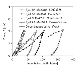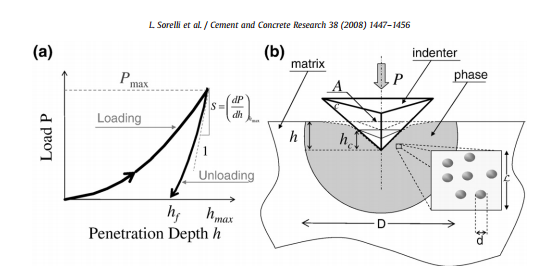 检查P-h曲线,以确定每条曲线的有效性。少于5%的不连续位移图在压痕深度中观察到“跳跃”(图4),这可能与开裂有关。假设最大穿透深度hmax在50 ~ 300 nm之间,满足式(8)的可分性尺度条件,则SNT提供了对各相性质的访问。例如,d的主要候选者是~5 nm的单个胶体凝胶颗粒或小于2 nm的C-S-H片的尺寸,而水化良好的水泥浆体的特征尺寸d约为1-3 μm[22,24]。同样,石英粉、残余熟料、石英砂的晶粒尺寸D分别为0.1 100 μm、1 ~ 10 μm、150 ~ 600 μm,而各相的晶粒尺寸均远小于hmax。