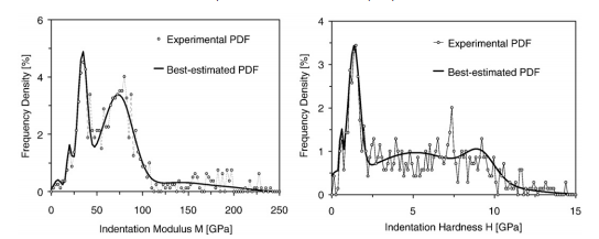 图7所示。用反褶积技术对压痕模量M (a)和压痕硬度H (b)评估的实验频率图和最佳估计PDF
