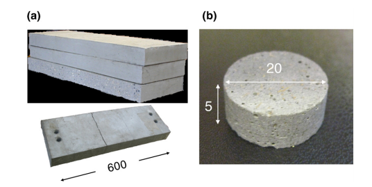 图1 (a) UHPC板,50 × 200 × 600 mm,取芯;(b)其中一个经测试的便士形样本的照片风化层模拟物