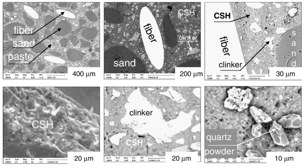 图6显示了10−4 -10−5 m不同长度尺度下的SEM图像。在400 μm尺度下,可以分辨出水泥浆体中纤维和石英砂的夹杂物。在较小的尺度下,在水泥浆体中可以看到一些直径约为10 μm的残余熟料颗粒。石英粉看起来像嵌在膏体中的微小颗粒,正如尖锐的边缘所表明的那样,它们应该没有与周围的膏体发生反应。然而,最近的高分辨率扫描电镜研究表明,石英粉的最细部分(粒径小于1 μm)可以与孔隙溶液发生反应。没有观察到波特兰石晶体(或氢氧化钙,CH)和硅灰,可以认为通过火山灰反应已完全转化为C-S - H。纤维周围的区域看起来很致密,尽管在砂粒附近可以检测到很少的微裂纹。图3所示。(a)典型荷载-压痕深度P-h曲线;(b)均匀相上用伯科维奇压头进行压痕试验的示意图。