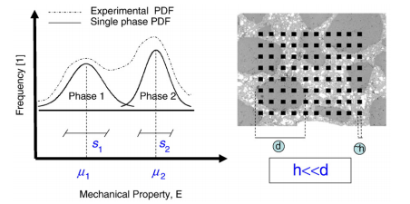 认识到水泥基材料的高度非均质性,特别是UHPC,需要进行大量的纳米压痕测试并进行统计分析。这种统计纳米压痕技术(SNT)的前提是,每次压痕试验都是一个单一的统计事件,从连续压痕分析中提取的特性是随机变量(图5)。通常,在表面样品的网格上进行大量的一系列压痕试验;例如,100个压痕足以保证LD和HD C-S-H的弹性性能收敛,误差小于5%。然后通过n个理论概率分布函数pJ的和对力学性能x= (H, M)的离散实验分布值P(x)进行反卷积来分析数据,每个理论概率分布函数pJ代表一个不同的力学相: