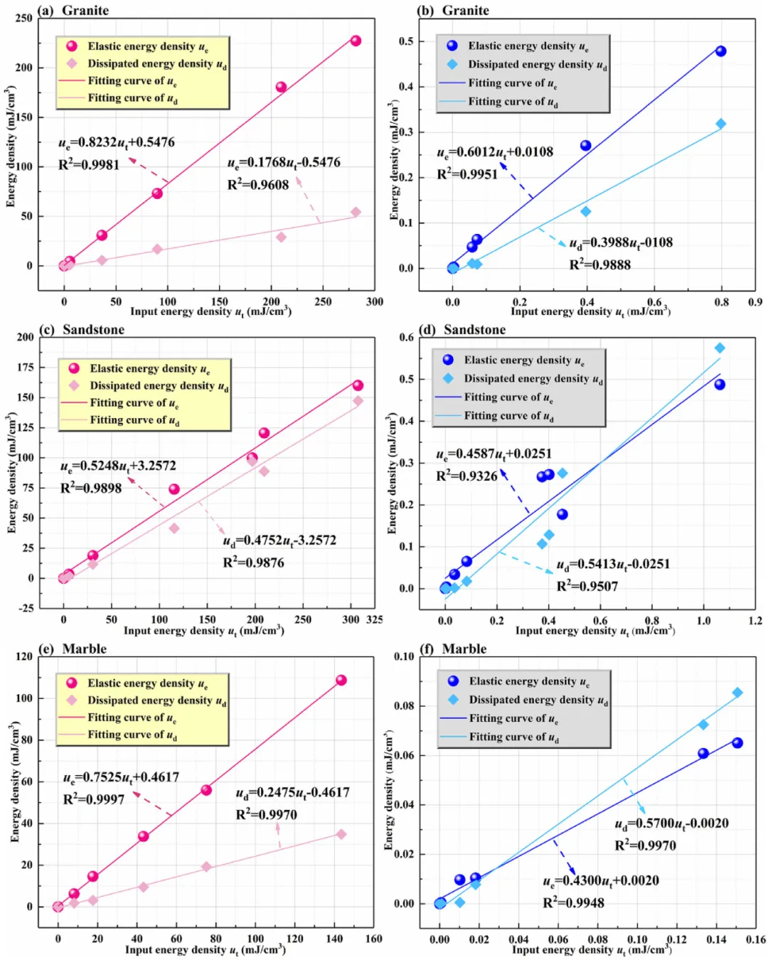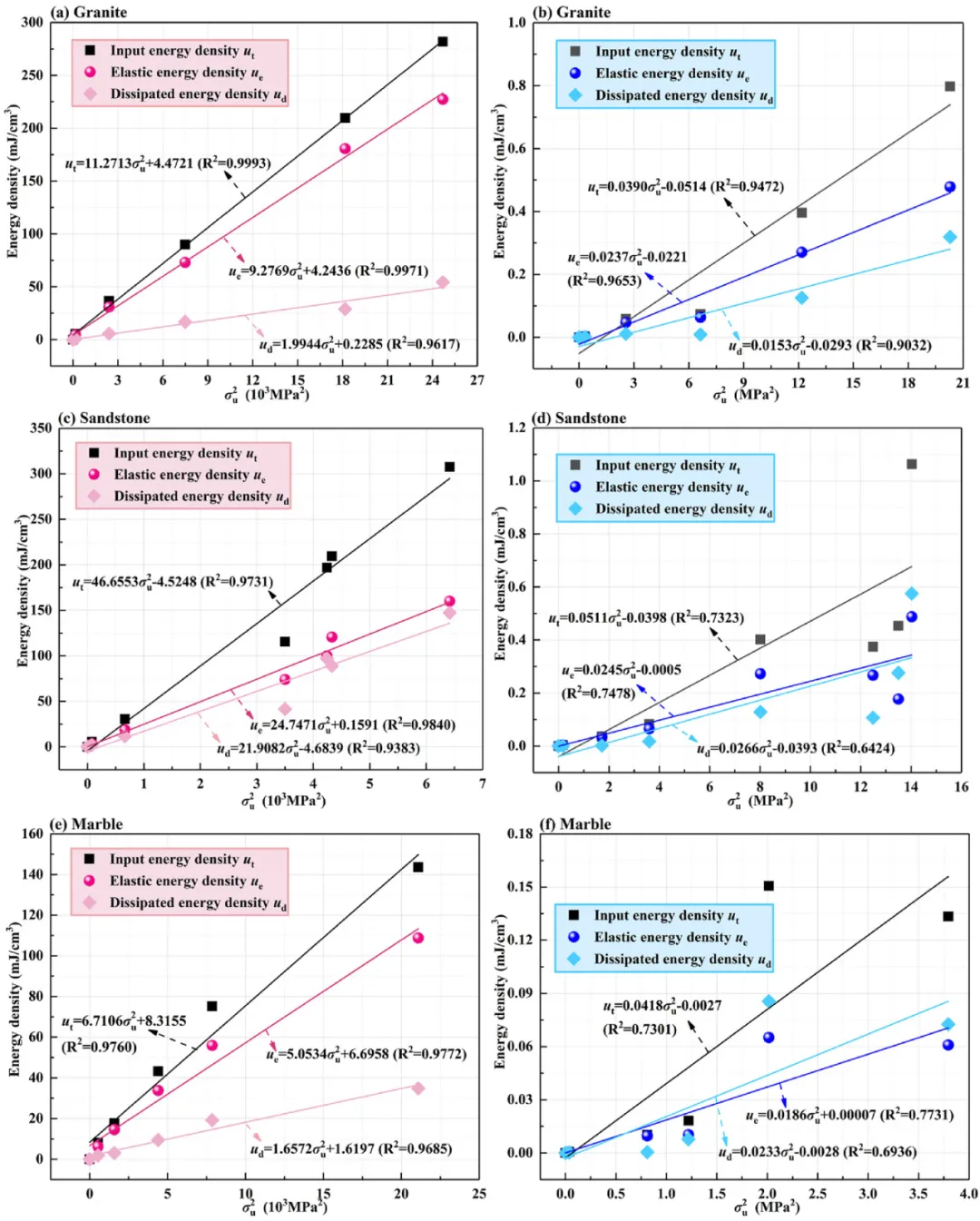 在UCT中,三个能量参数(ut、ue和ud)与卸载应力的平方之间存在很强的线性关系。然而,在UTT中,它们之间的线性关系较弱,特别是对于砂岩和大理石,这可能是因为岩石的拉伸行为更容易受到固有缺陷的影响。