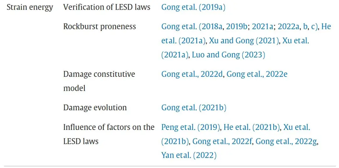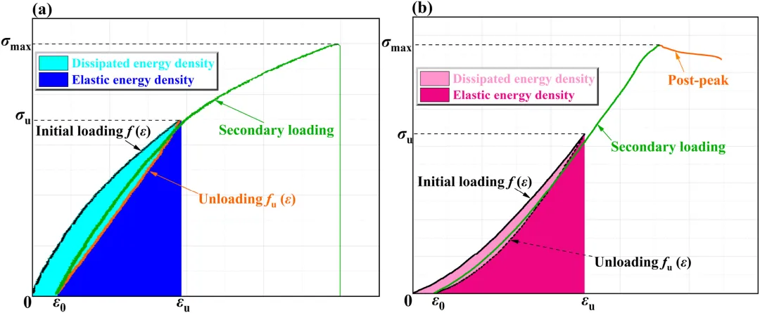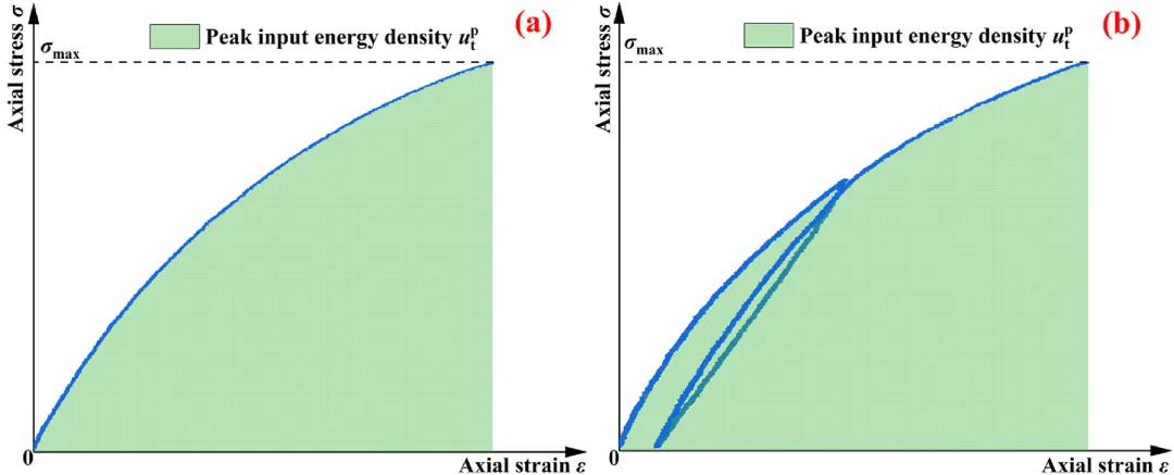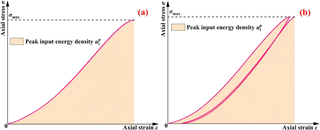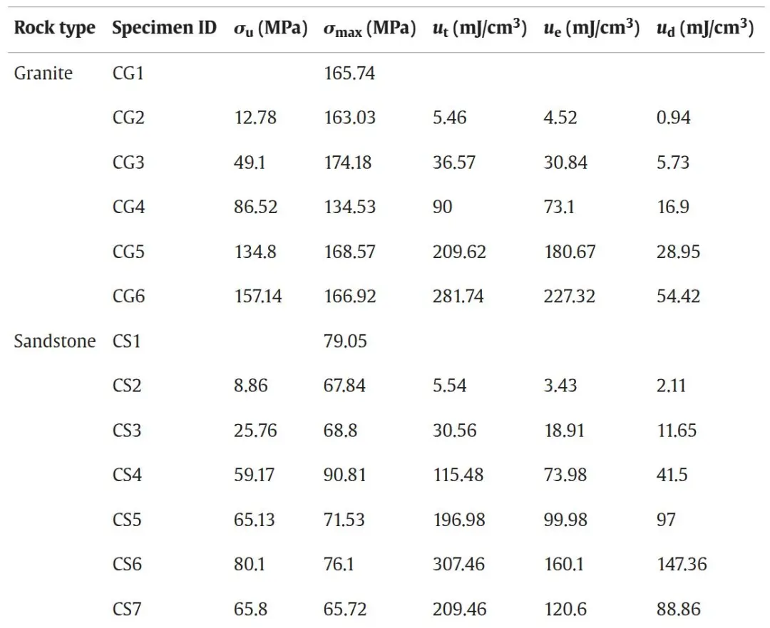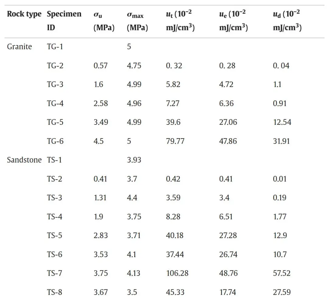 最近,能量成为岩石力学领域的研究热点。众所周知,岩石在外力作用下的变形和破坏本质上是一个能量传递过程。外力作用于岩石,并向岩石系统输入能量。一部分输入能量转化为弹性应变能,并在岩石破坏的瞬间释放。另一部分输入能量用于颗粒摩擦、塑性变形和微裂纹扩展,然后被耗散。因此,从能量的角度研究岩石的力学行为具有重要意义。一般来说,岩石破坏所需的能量可以从两个方面考虑:断裂(表面能)和变形(应变能)。表面能用于量化生成新自由表面所需的能量,通常用于分析岩石的断裂行为。应变能通常用于分析岩石的储能能力和损伤特征。例如,近年来,单轴压缩下的线性储能和耗散(LESD)定律得到了反复证实,并基于LESD定律进行了一些引人注目的工作。然而,单轴拉伸下的能量演化特征很少有报道。