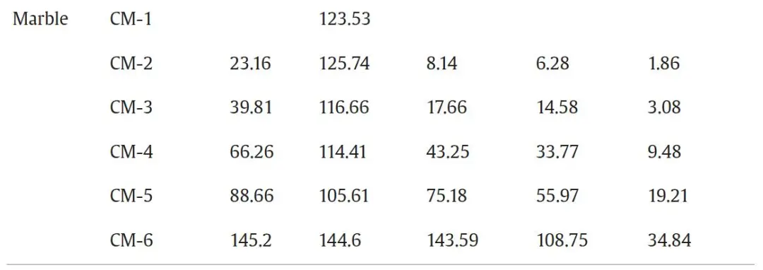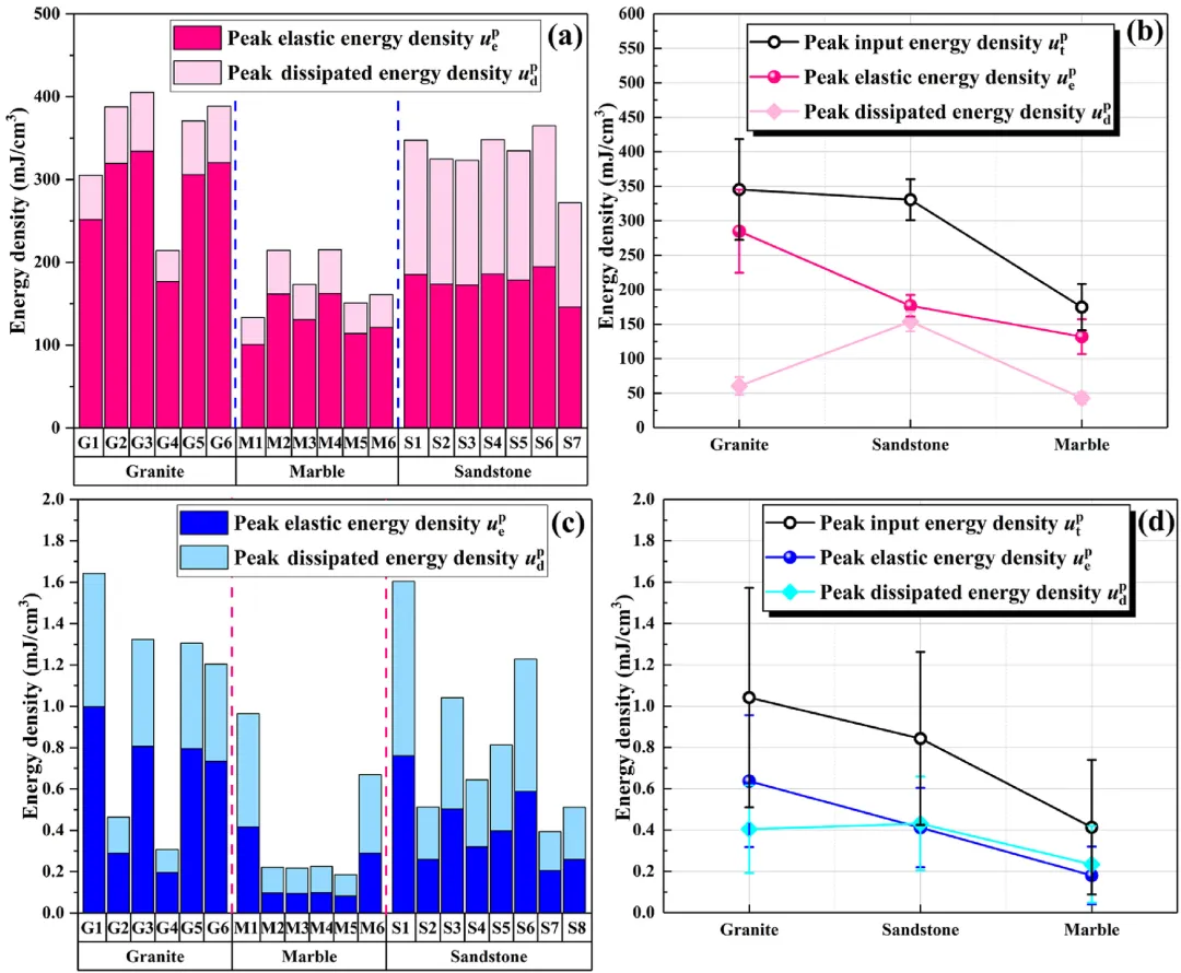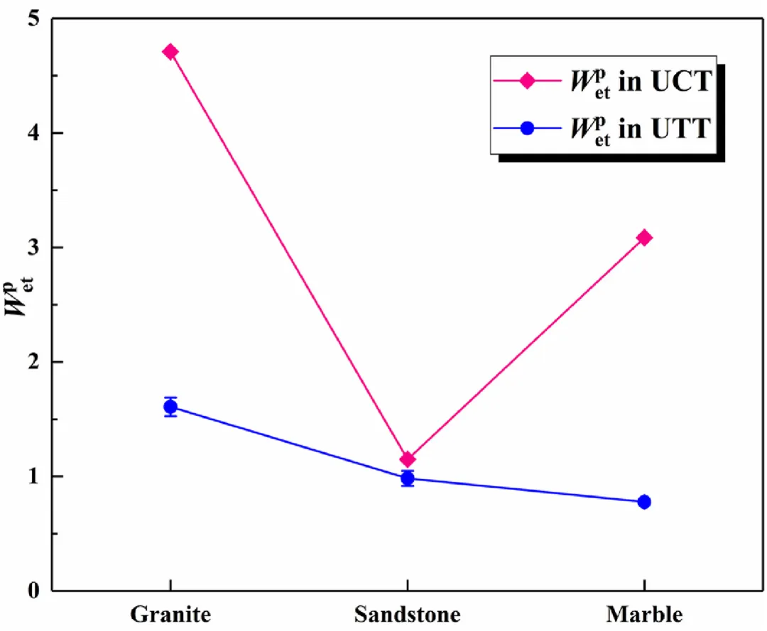 基于ue和ud随ut线性增加的现象,证明了Wetp指数在UTT中的适用性。计算了峰值输入能量密度utp、峰值弹性能量密度uep和峰值耗散能量密度udp,并评估了UCT和UTT中三种岩石的相对储能能力和绝对能量分布特征。在UCT中,岩石的相对储能能力从强到弱的顺序如下:花岗岩>大理石>砂岩,在UTT中,顺序为花岗岩>砂岩>大理石。在UTT和UCT中,绝对能量吸收能力(与utp相关)和绝对能量储存能力(与uep相关)从强到弱的顺序是花岗岩>砂岩>大理石。UCT的绝对耗能能力从强到弱的顺序是砂岩>花岗岩>大理石,而在UTT中,是砂岩≈花岗岩>大理石。