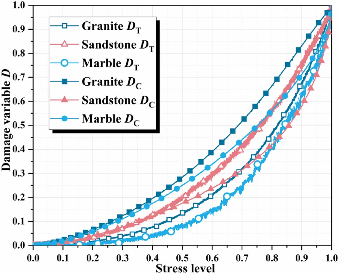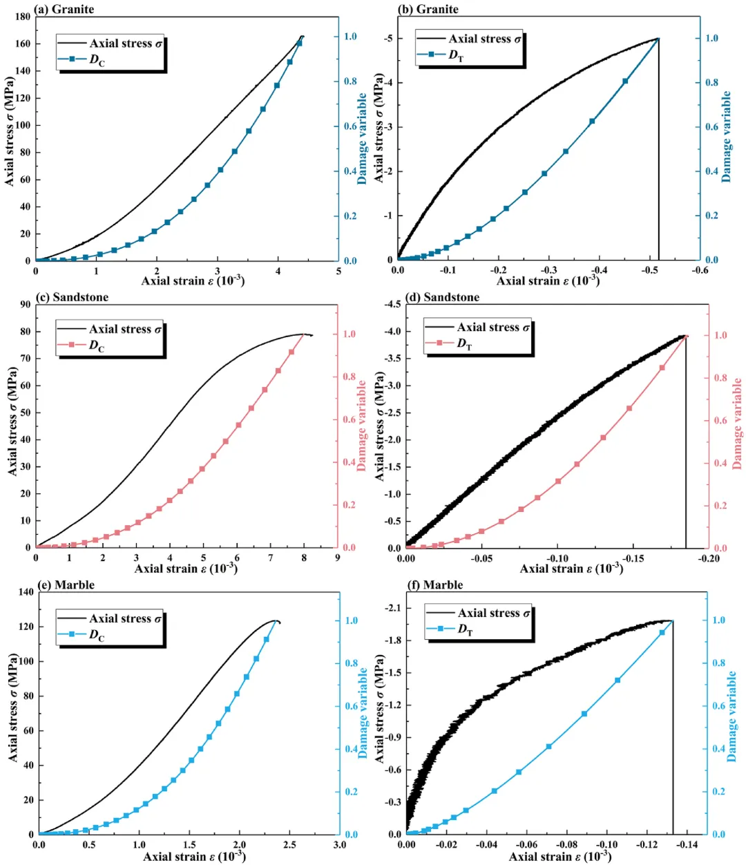 基于能量耗散建立的DT可以很好地描述岩石在单轴拉伸下的损伤。讨论了三种岩石在单轴压缩和单轴拉伸下的损伤演化。