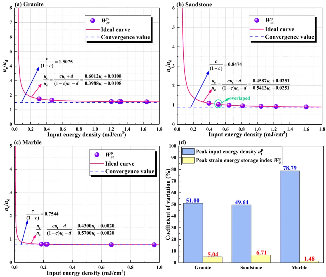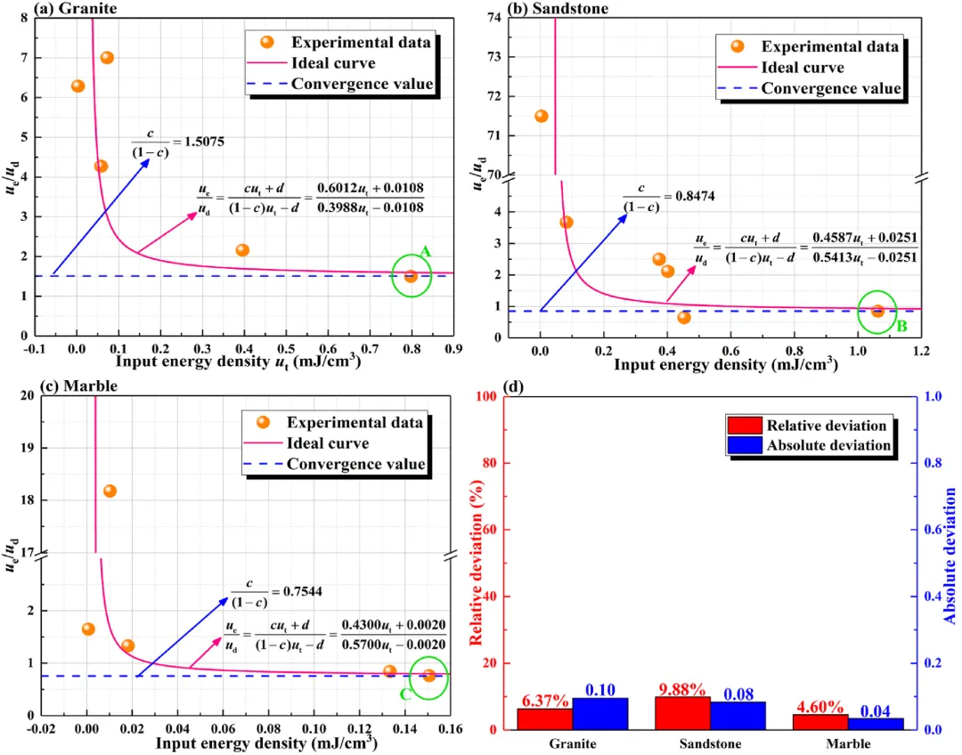 图7:ue/ud的实验数据和理想曲线的比较:(a)花岗岩,(b)砂岩,(c)大理石,以及(d)实验数据(点A、B和C)与理想曲线之间的相对和绝对偏差。