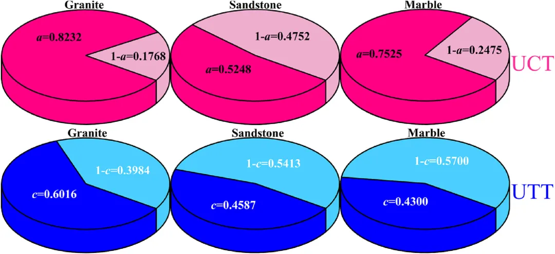 在UCT和UTT中,ue和ud均随ut的增加呈线性增加。砂岩和大理岩的拉伸行为在UTT中经历了两个阶段。在第一阶段,更多的输入能量转化为弹性能(ue>ud),在第二阶段,更多输入能量转化成耗散能(ud>ue)。相比之下,花岗岩具有更强的储能能力,弹性能总是大于耗散能。
