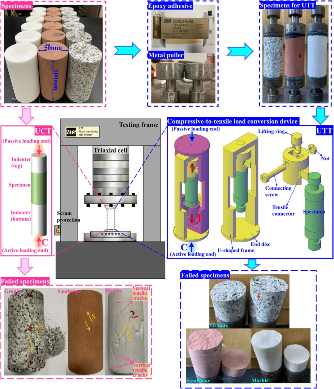已经使用了几种方法来确定岩石的拉伸性能,如单轴拉伸试验、巴西试验和三点弯曲试验。一般来说,在间接拉伸试验中,岩石不会受到纯单轴拉伸应力。相比之下,单轴拉伸试验被认为是获得岩石拉伸性能的理想方法。在过去的单轴拉伸实验研究中,许多研究人员关注的是拉伸装置、力学性能和声发射特性。