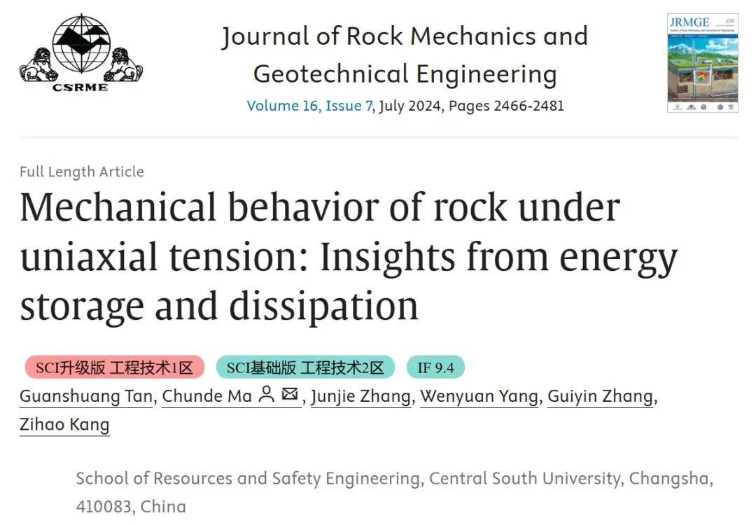 Guanshuang Tan, Chunde Ma, Junjie Zhang, Wenyuan Yang, Guiyin Zhang, Zihao Kang. Mechanical behavior of rock under uniaxial tension: Insights from energy storage and dissipation. Journal of Rock Mechanics and Geotechnical Engineering, 16 (2024) 2466-2481.