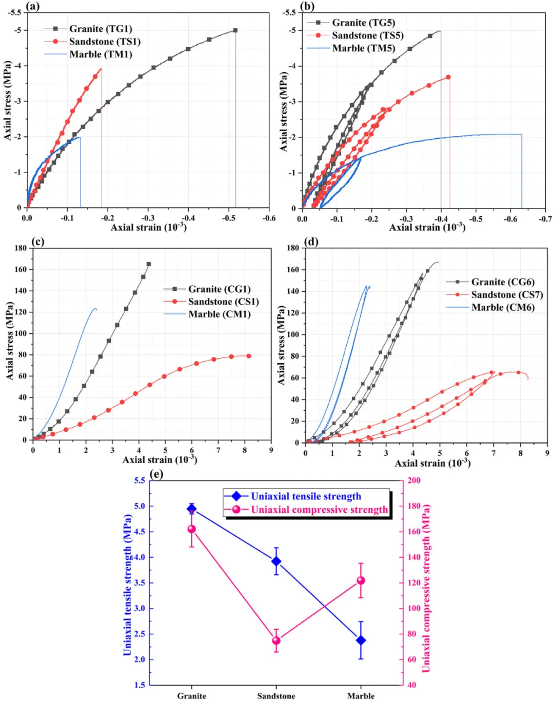 图3:三种岩石的代表性应力-应变曲线和强度:(a-b)UTT,(c-d)UCT,以及(e)单轴抗压强度和单轴抗拉强度。