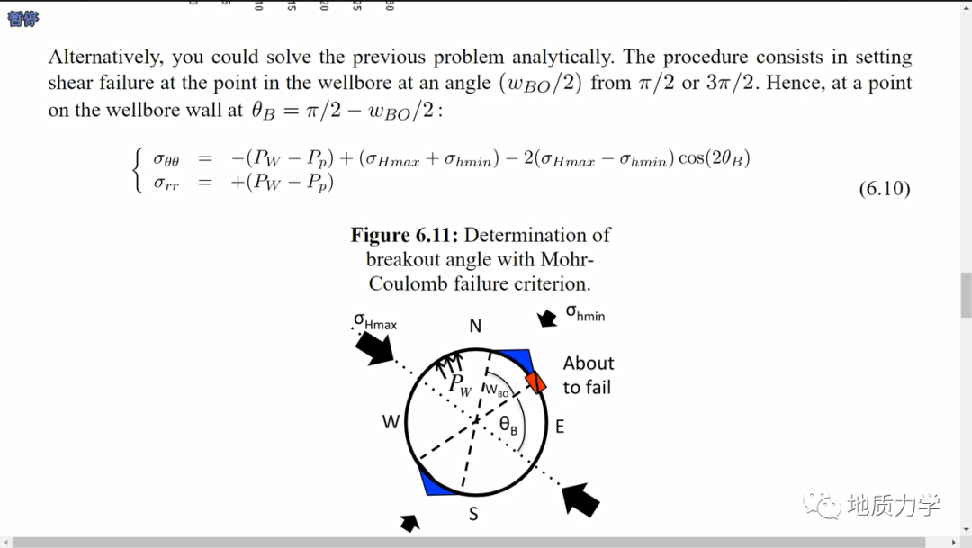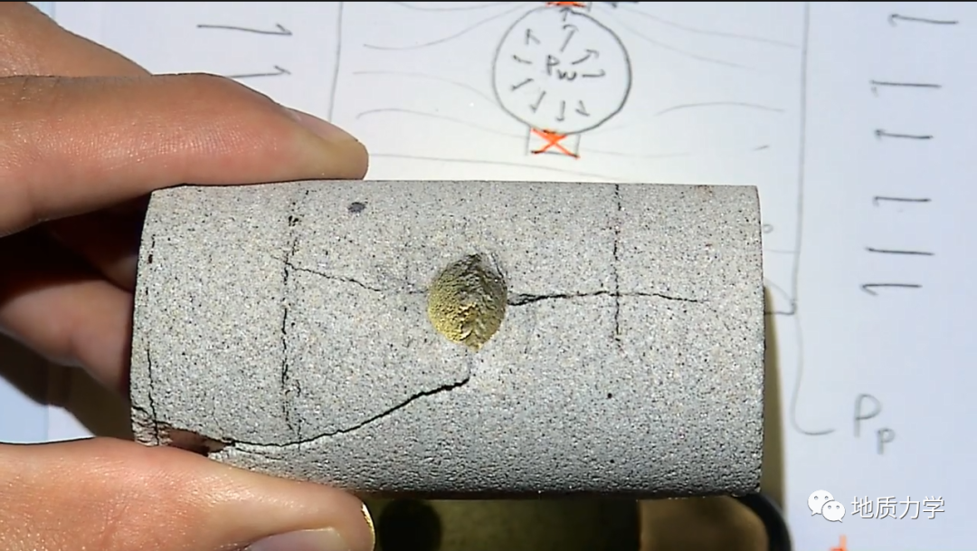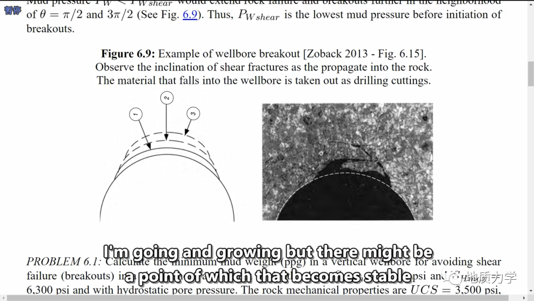 井眼的破坏类似上图所示,在标准岩心中间钻取一个井筒,并进行单轴加载实验,井筒在不同方向的破坏类型如上图所示;在最大主应力方向产生拉应力,导致拉伸破坏;在最小主应力方向,产生压缩应力,导致剪切剥落破坏。
